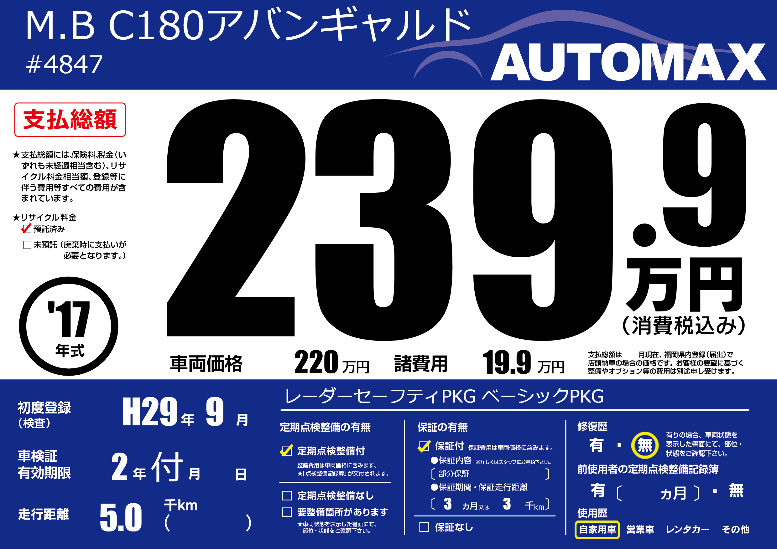 | 車名 | M.B C180アバンギャルド | グレード ミッション 排気量 |