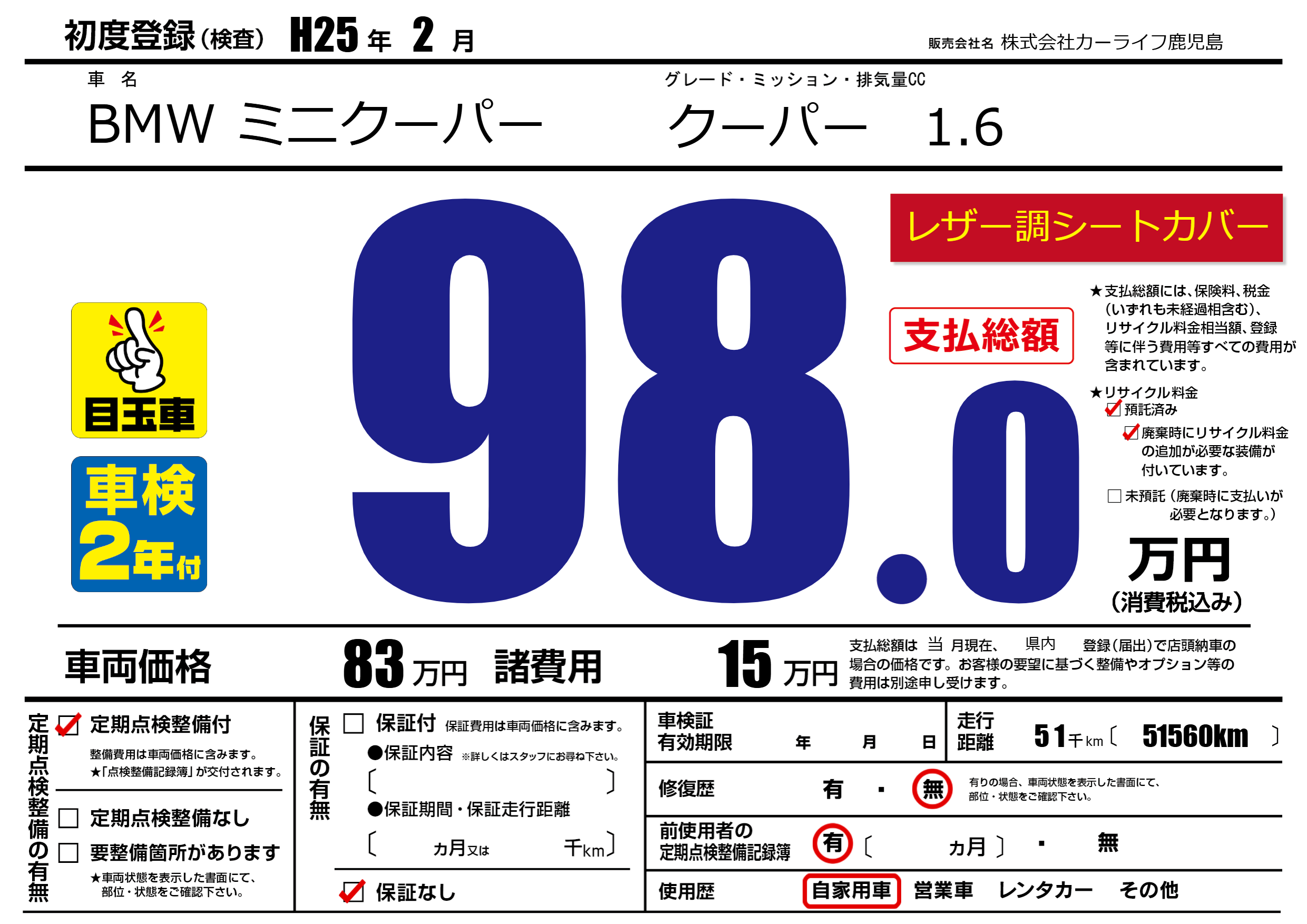 | 走行キロ | 0.5万km | 初年度登録 | H25年2月 |