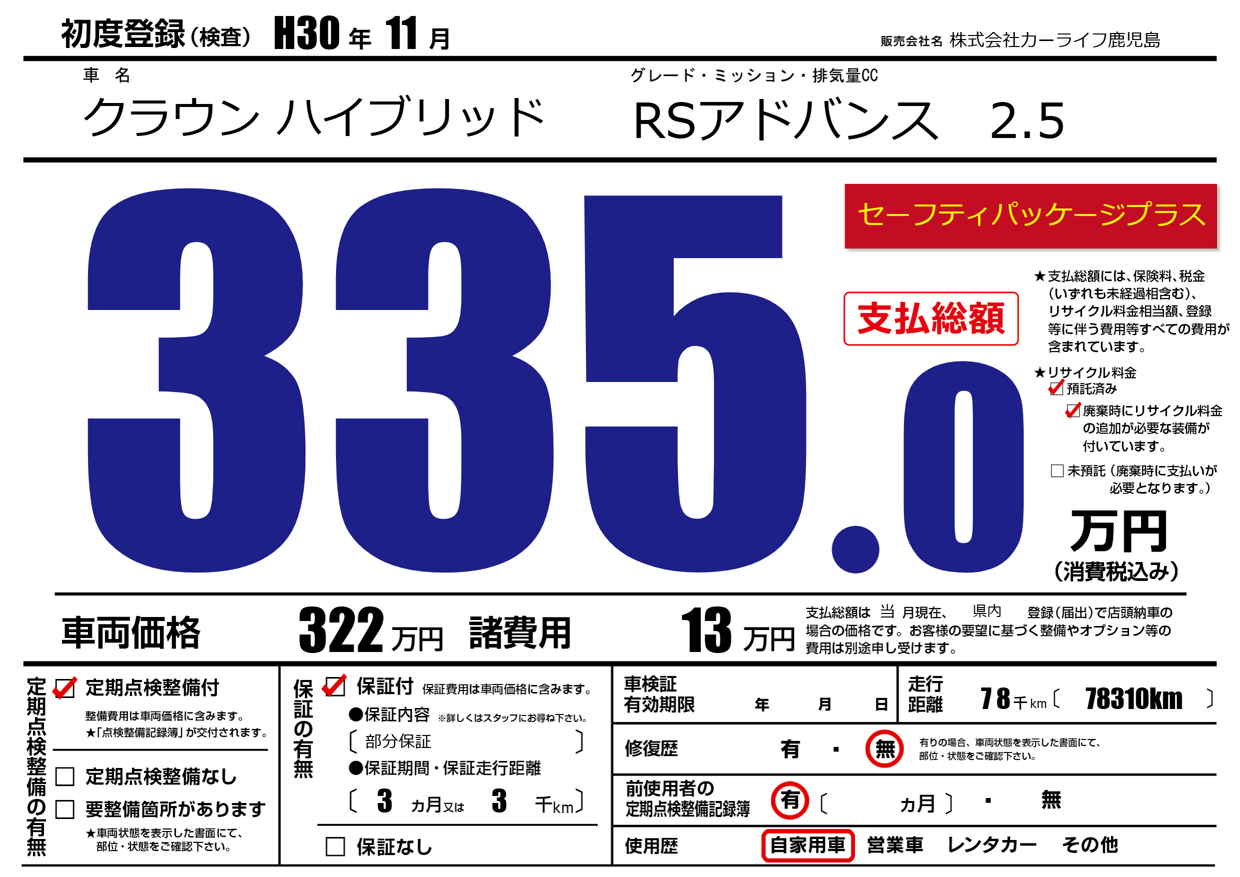 | 車名 | クラウン ハイブリッド | グレード ミッション 排気量 |
