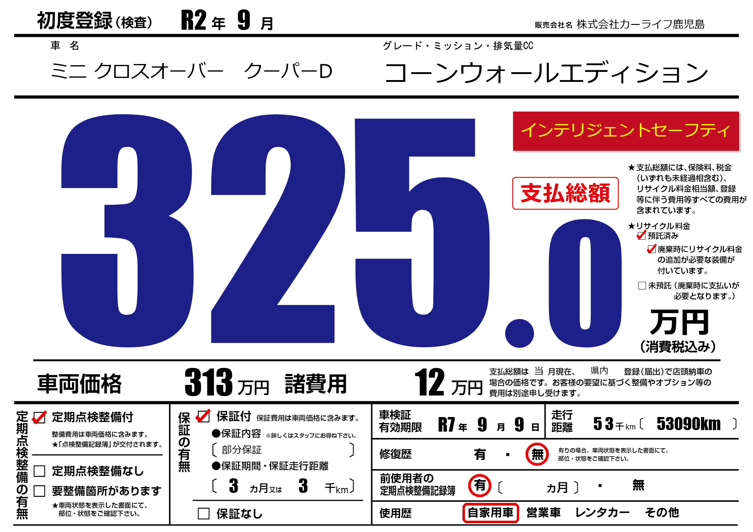 | 走行キロ | 0.5万km | 初年度登録 | R2年9月 |