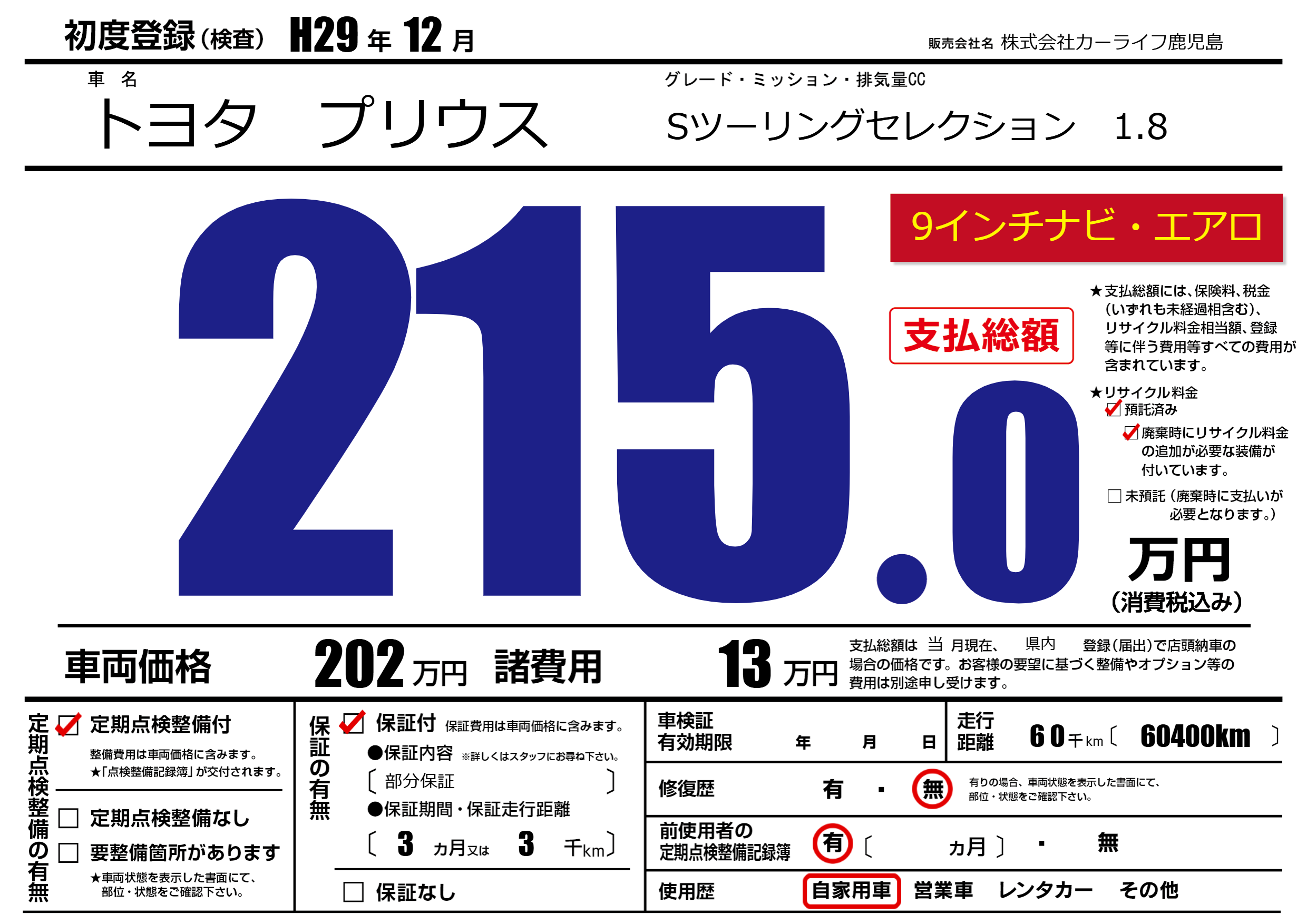 | 車名 | トヨタ プリウス | グレード ミッション 排気量 |