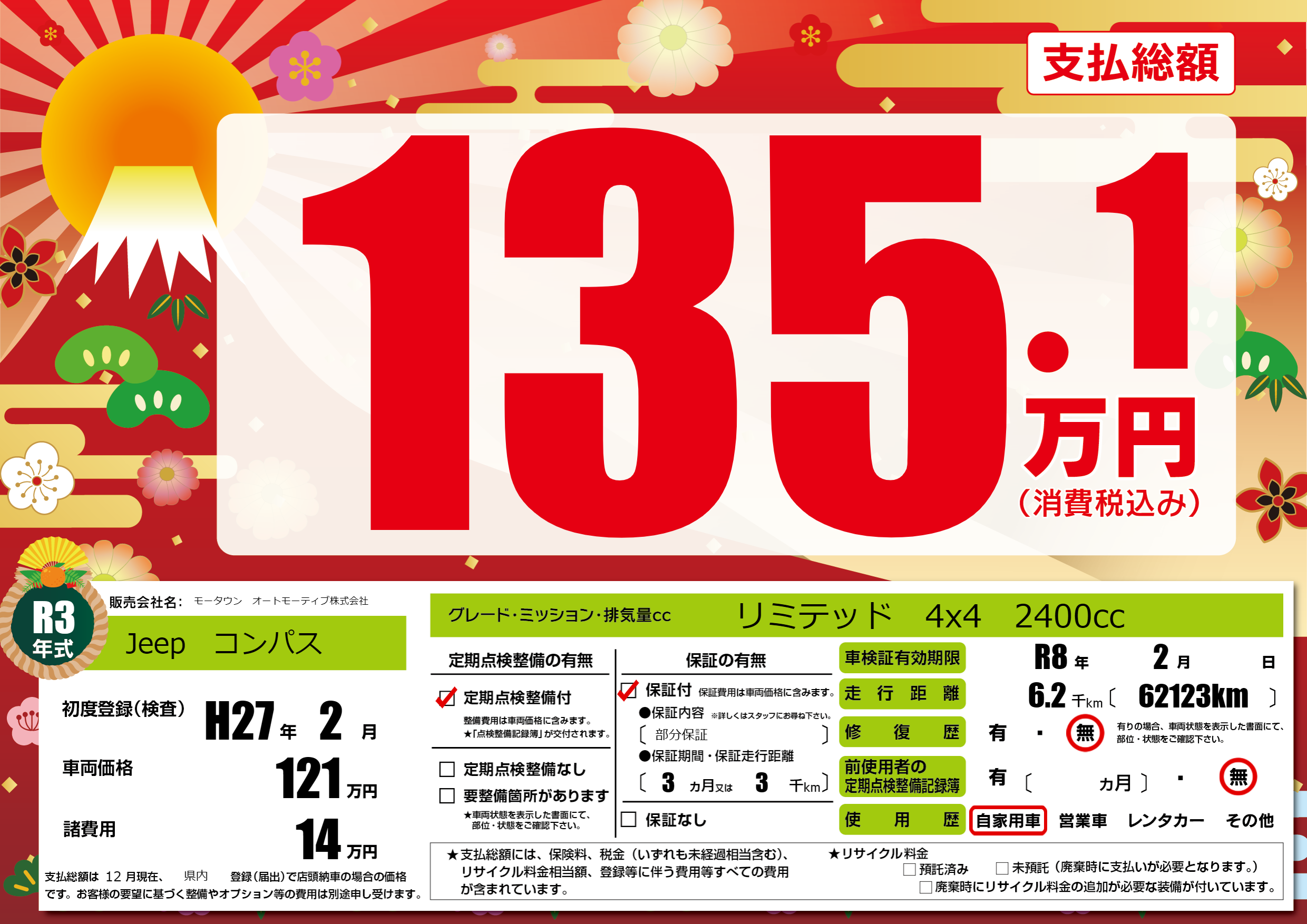 | 車検制限 | R8年 2月 - 日 | ||