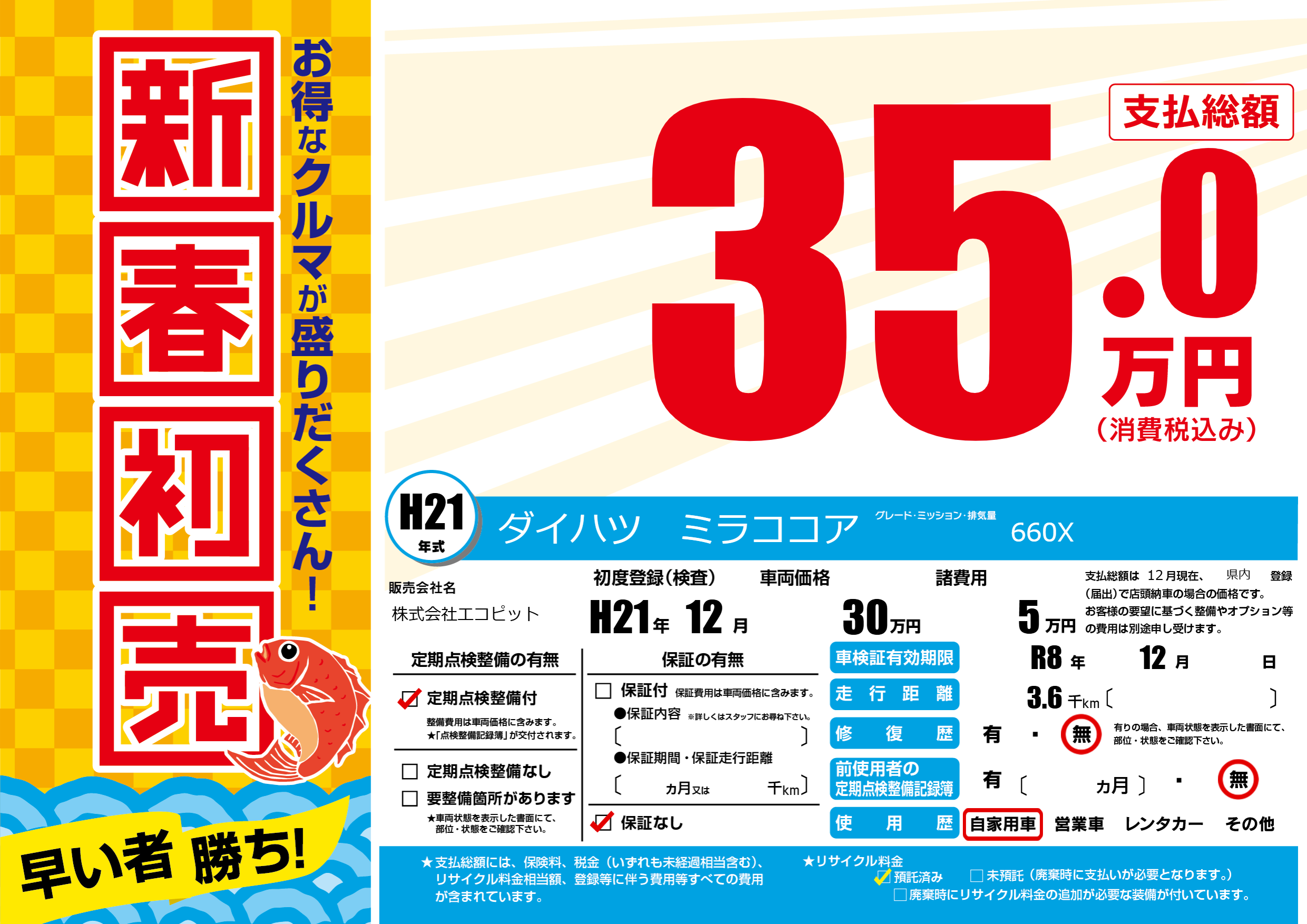 | 走行キロ | 0.3万km | 初年度登録 | H21年12月 |
