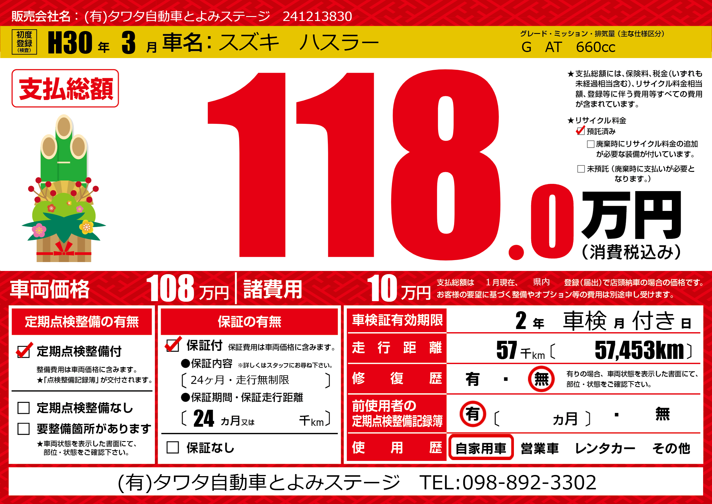 | 車名 | スズキ ハスラー | グレード ミッション 排気量 |