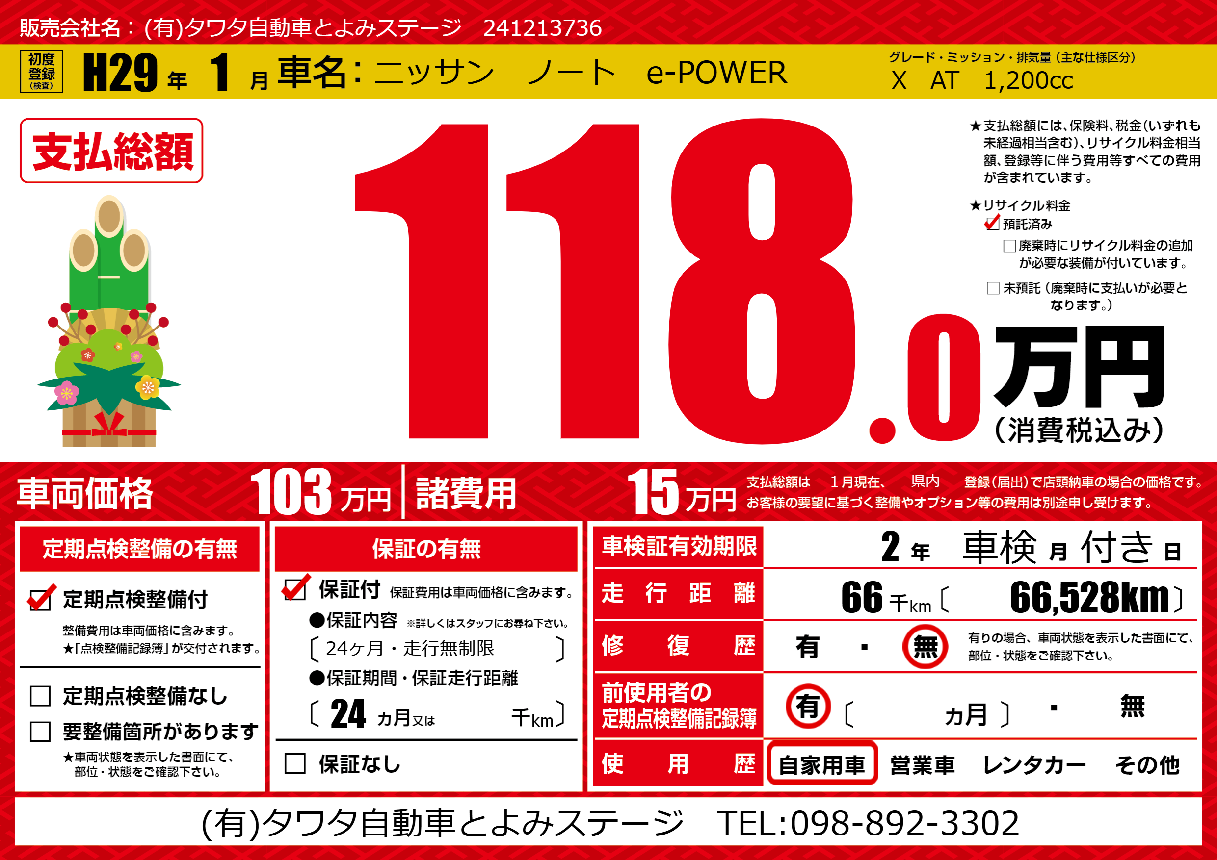 | 車名 | ニッサン ノート e-POWER | グレード ミッション 排気量 |
