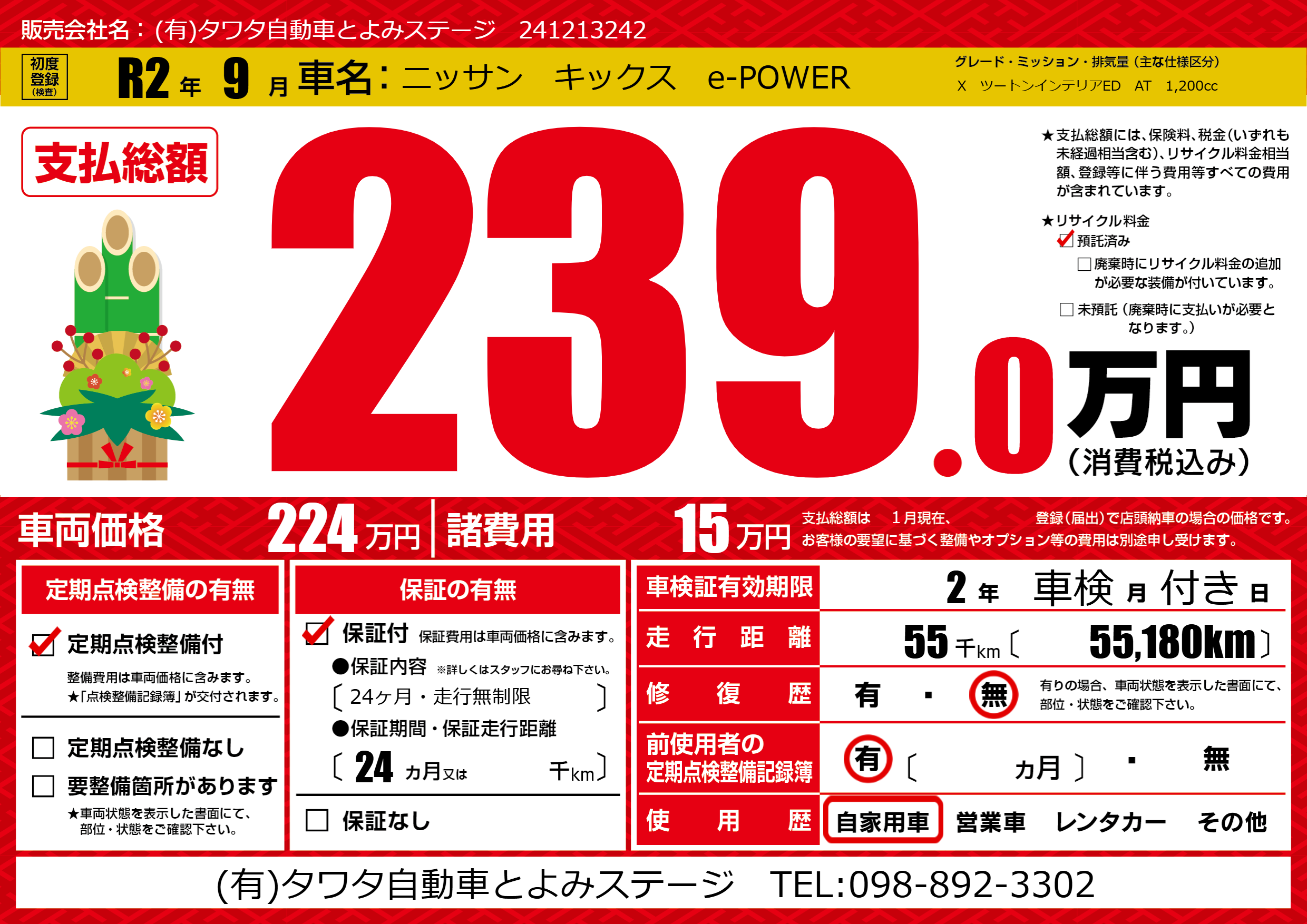 | 車名 | ニッサン キックス e-POWER | グレード ミッション 排気量 |