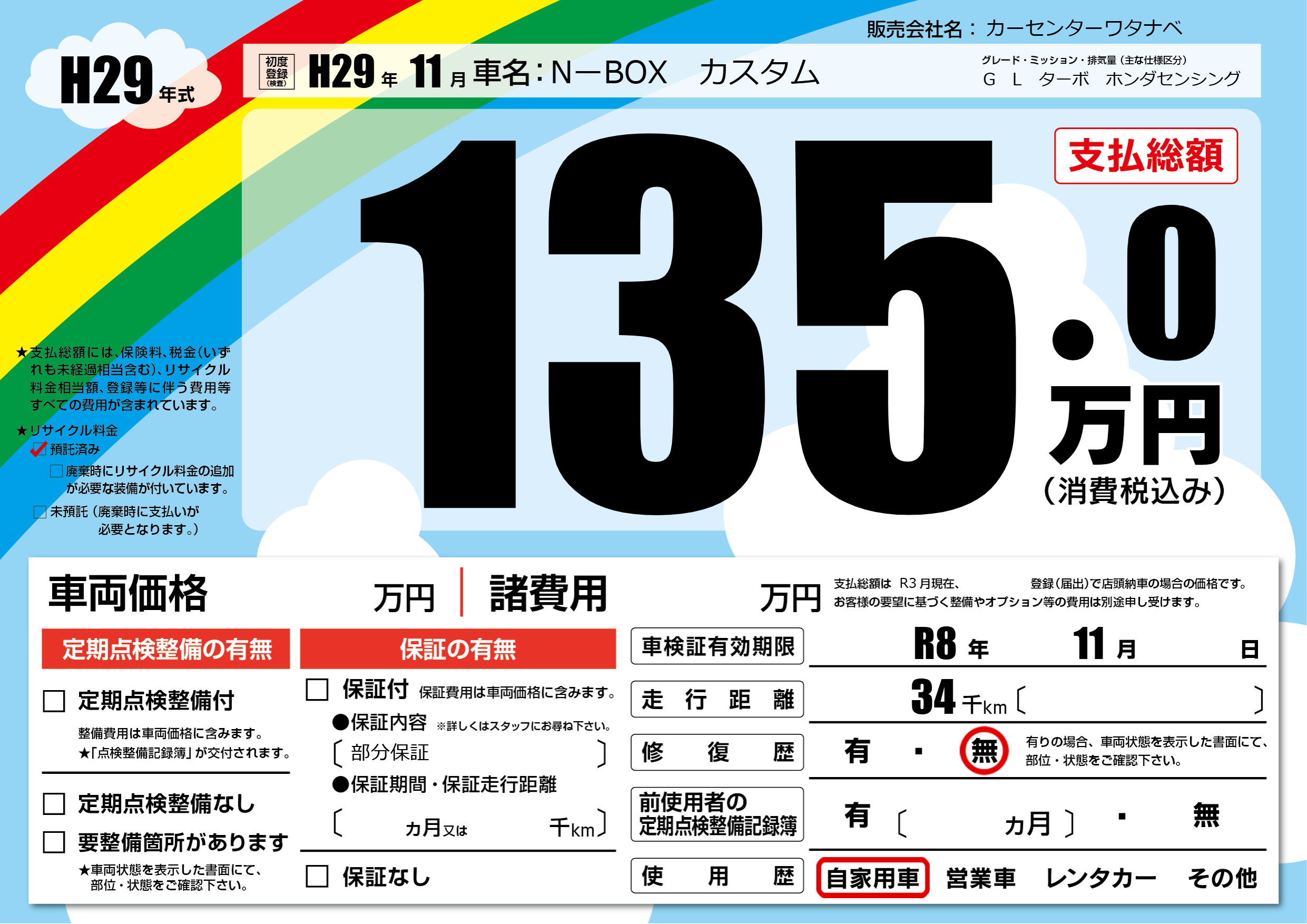 | 車名 | NーBOX カスタム | グレード ミッション 排気量 |