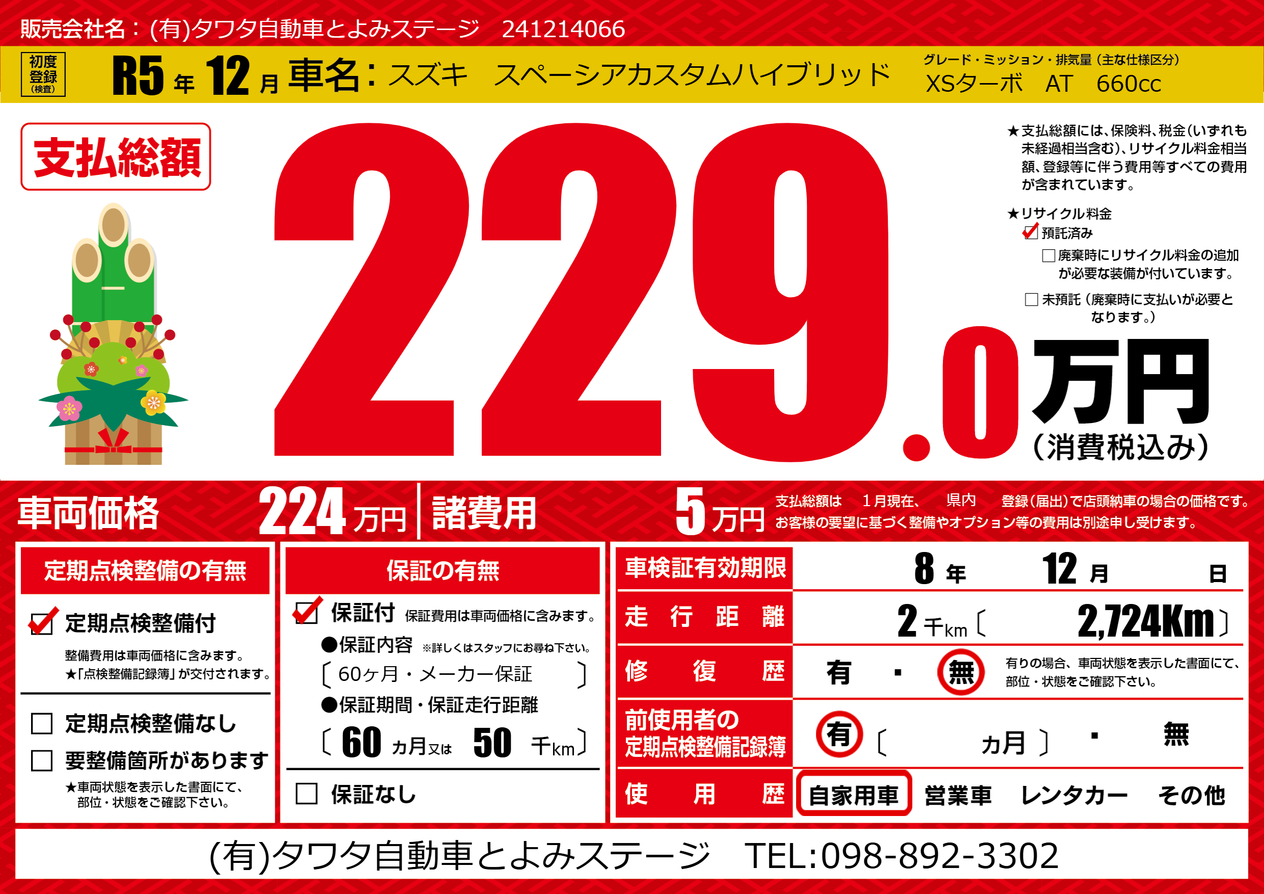 | 走行キロ | 0.2万km | 初年度登録 | R5年12月 |