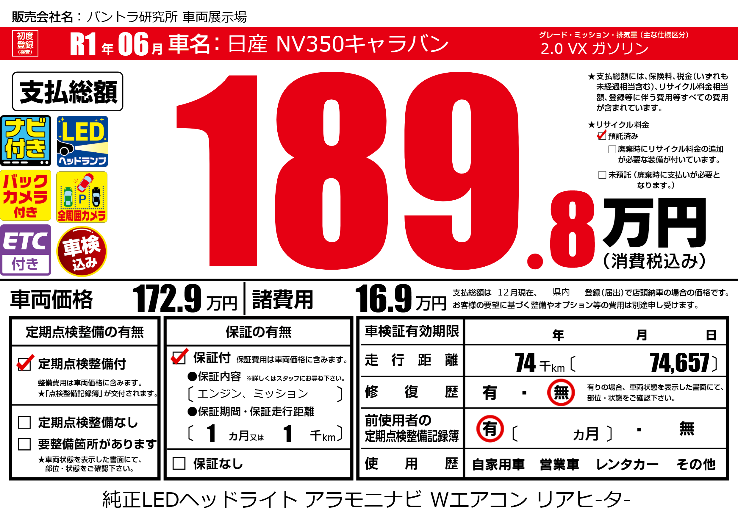 | 車名 | 日産 NV350キャラバン | グレード ミッション 排気量 |