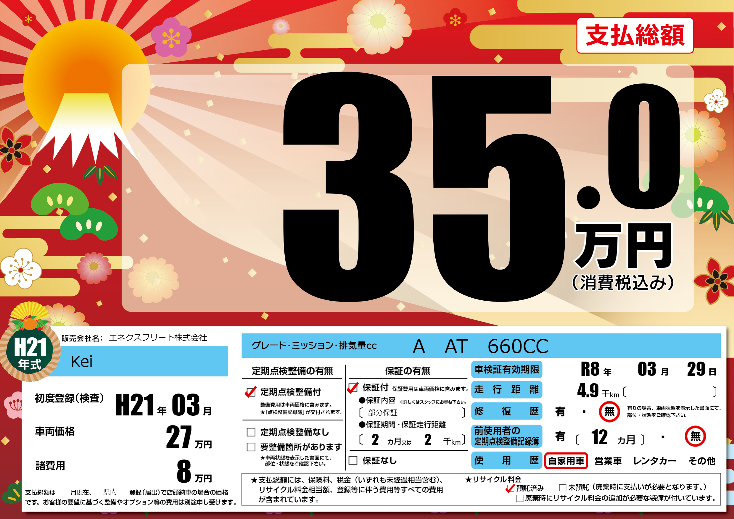 | 走行キロ | 0.4万km | 初年度登録 | H21年03月 |