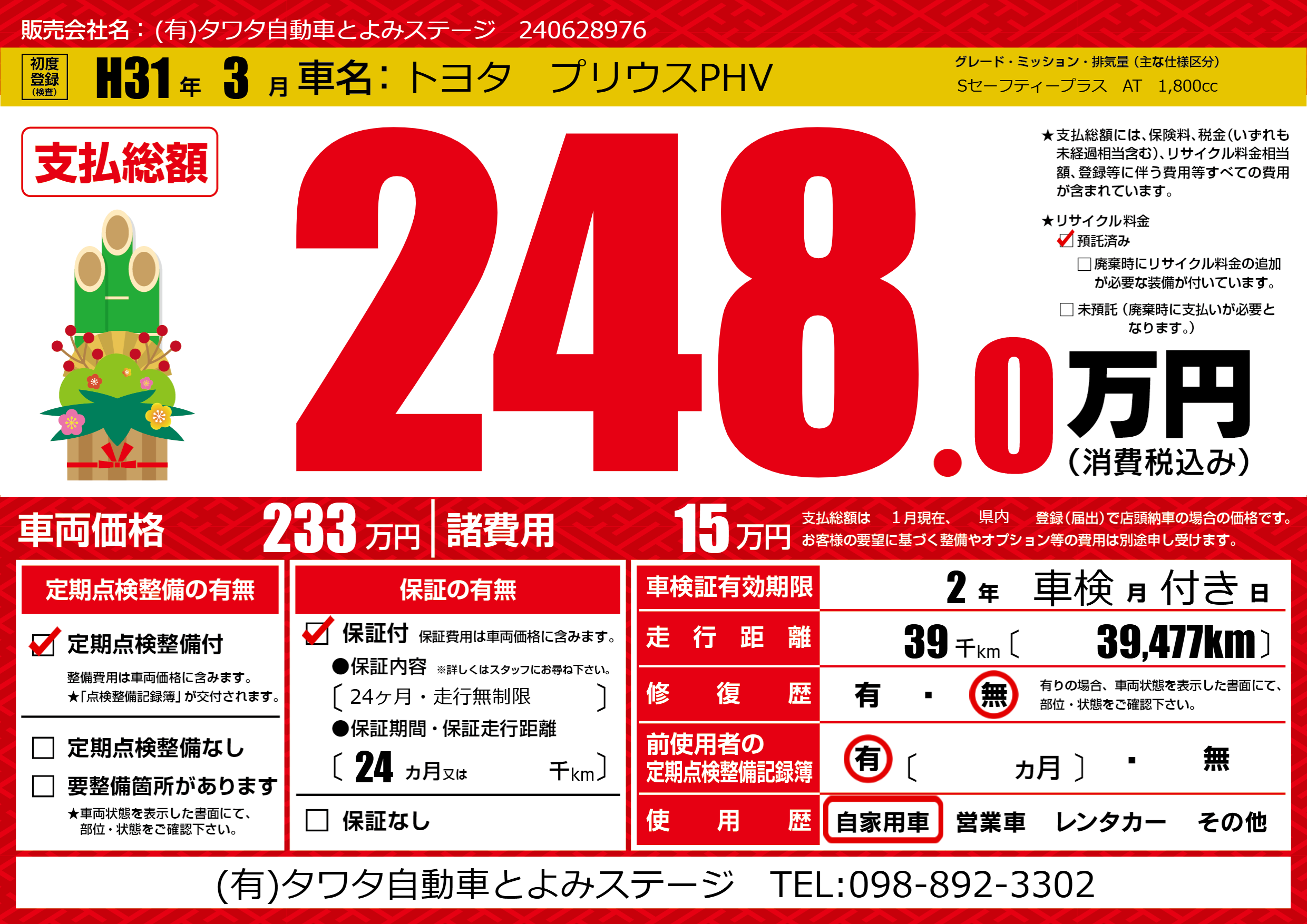 | 車名 | トヨタ プリウスPHV | グレード ミッション 排気量 |