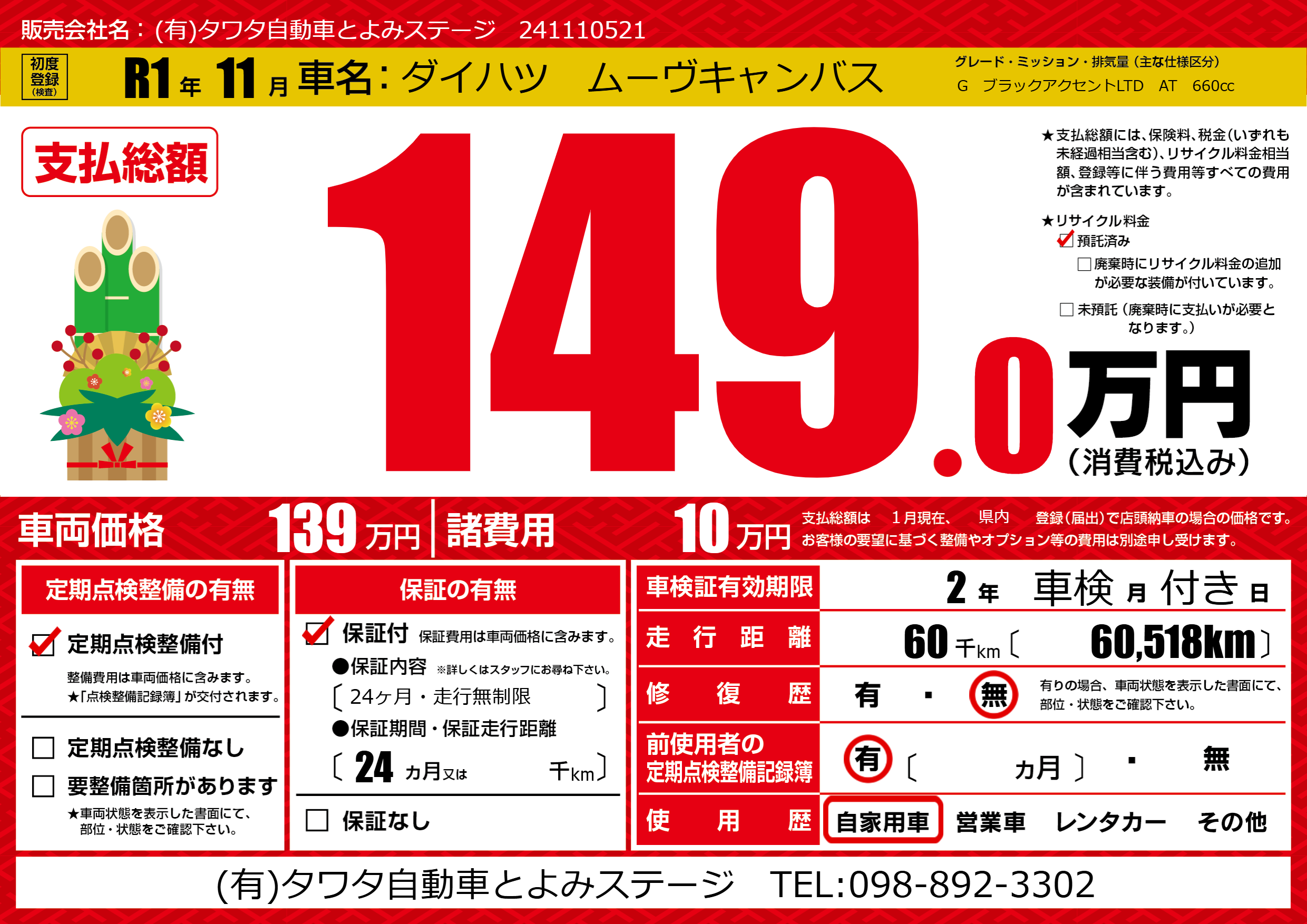 | 走行キロ | 6万km | 初年度登録 | R1年11月 |