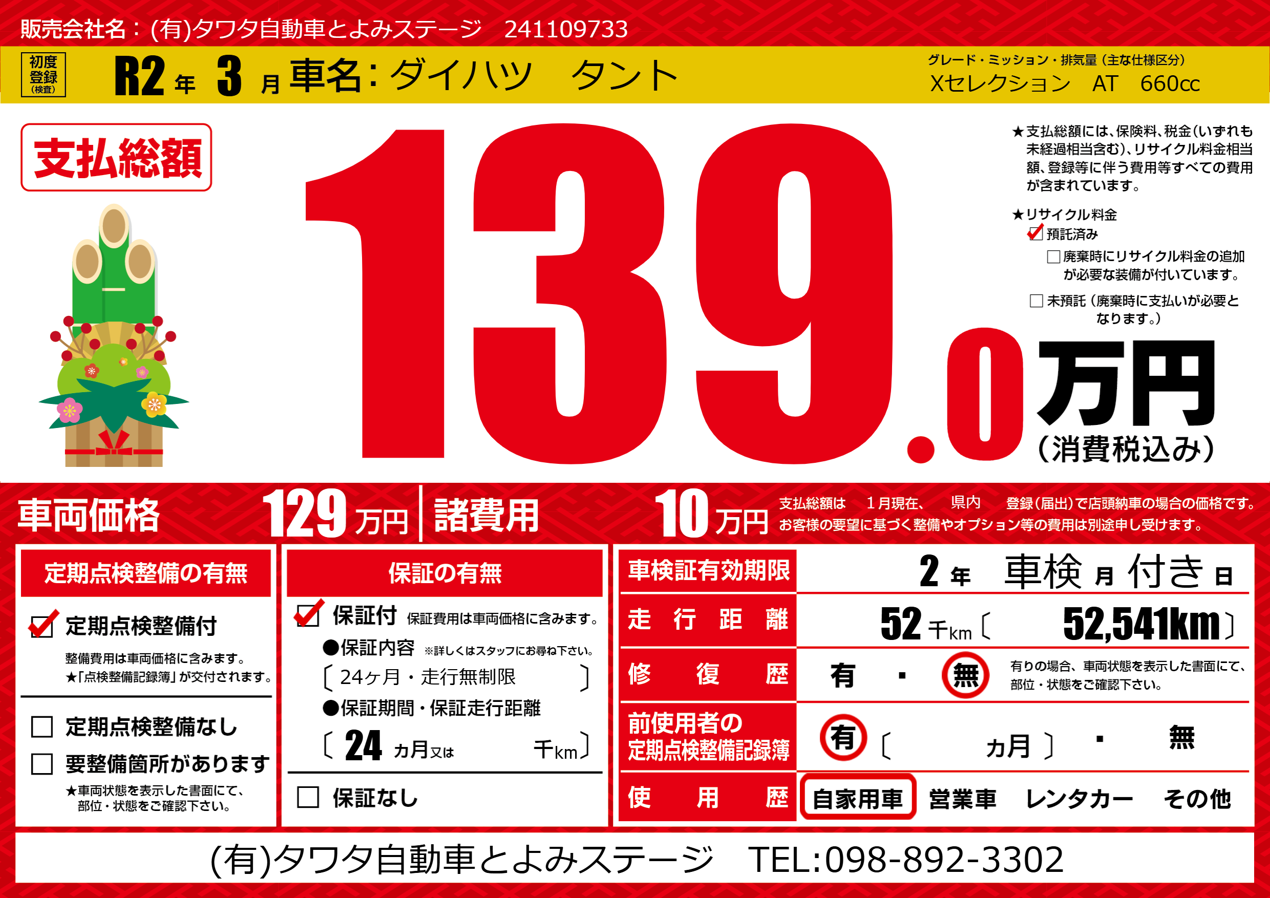 | 車名 | ダイハツ タント | グレード ミッション 排気量 |