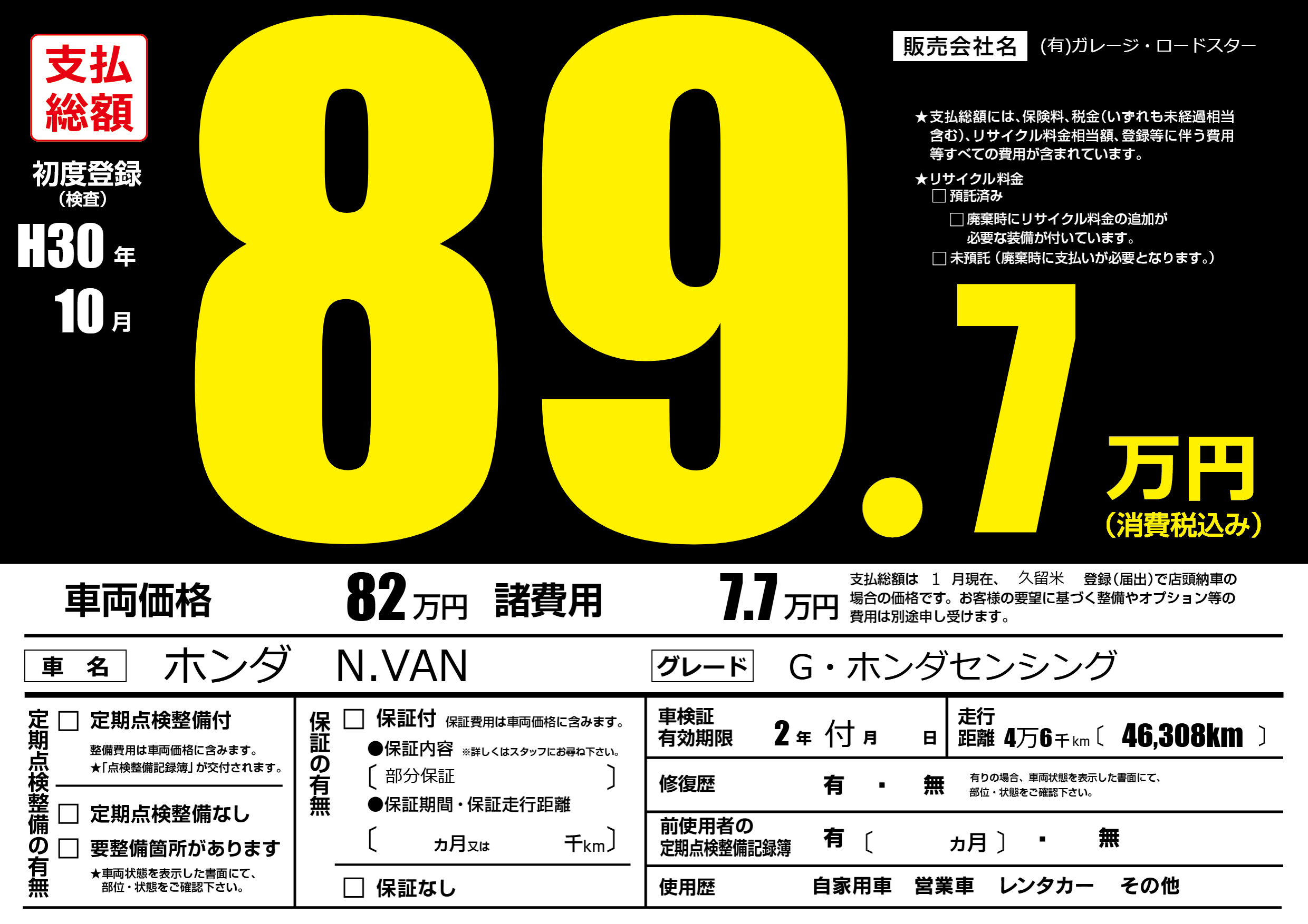 | 車名 | ホンダ N.VAN | グレード ミッション 排気量 |