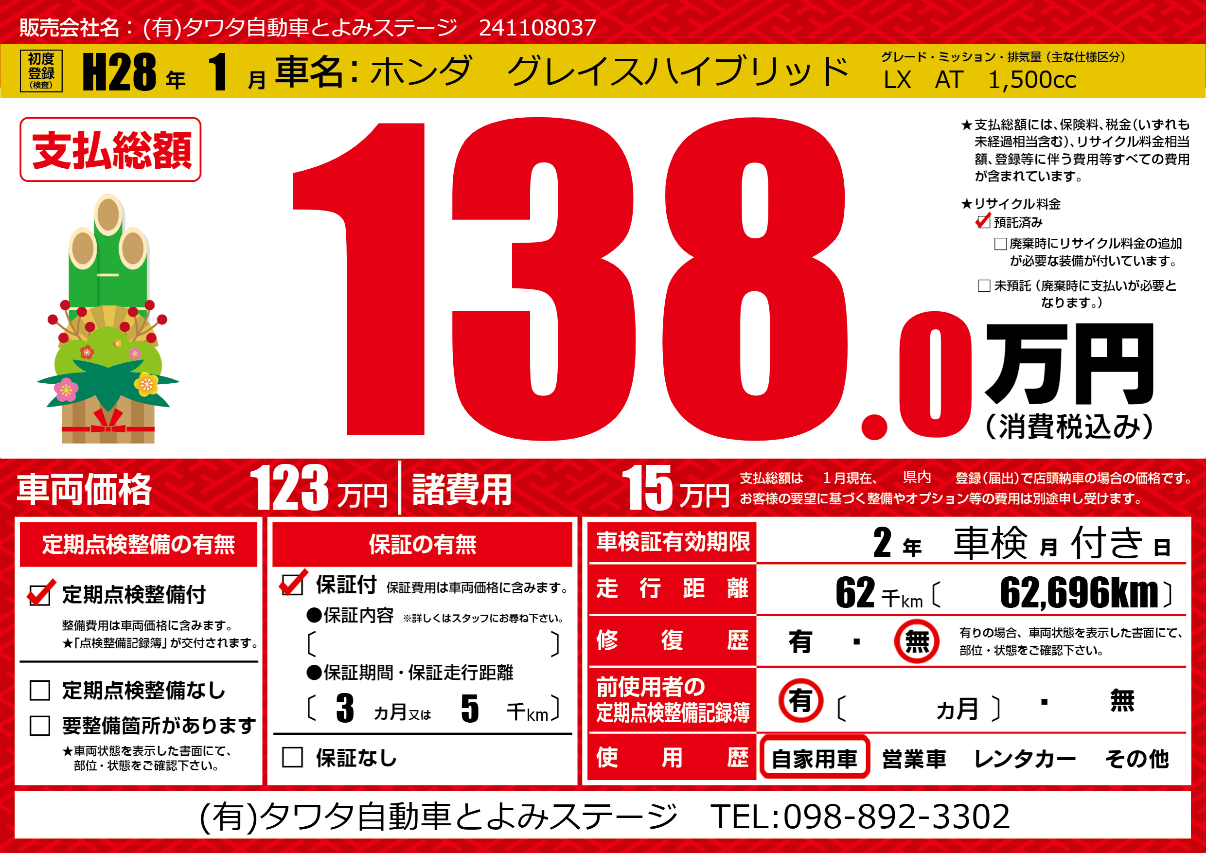 | 車名 | ホンダ グレイスハイブリッド | グレード ミッション 排気量 |