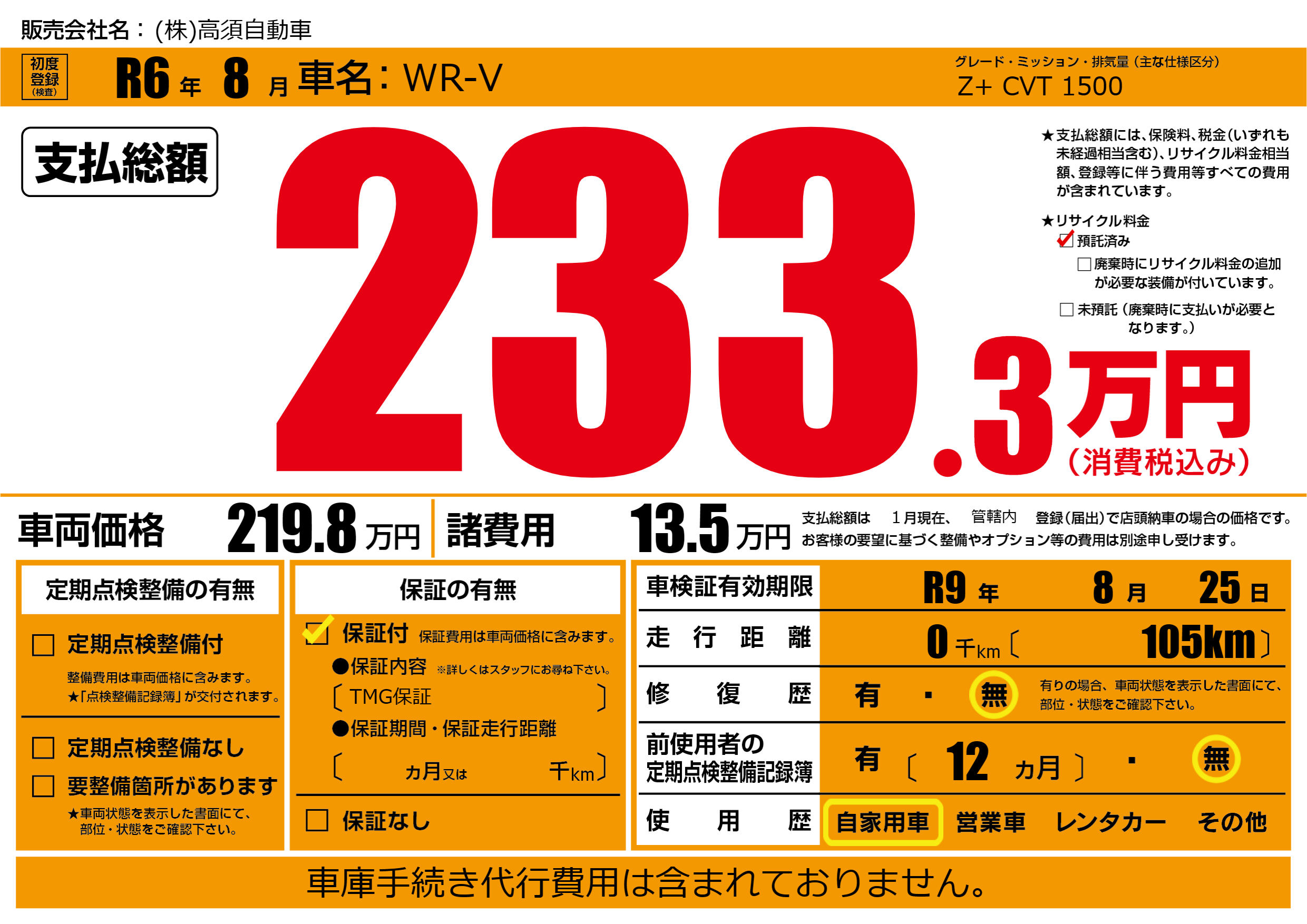 | 車名 | WR-V | グレード ミッション 排気量 |