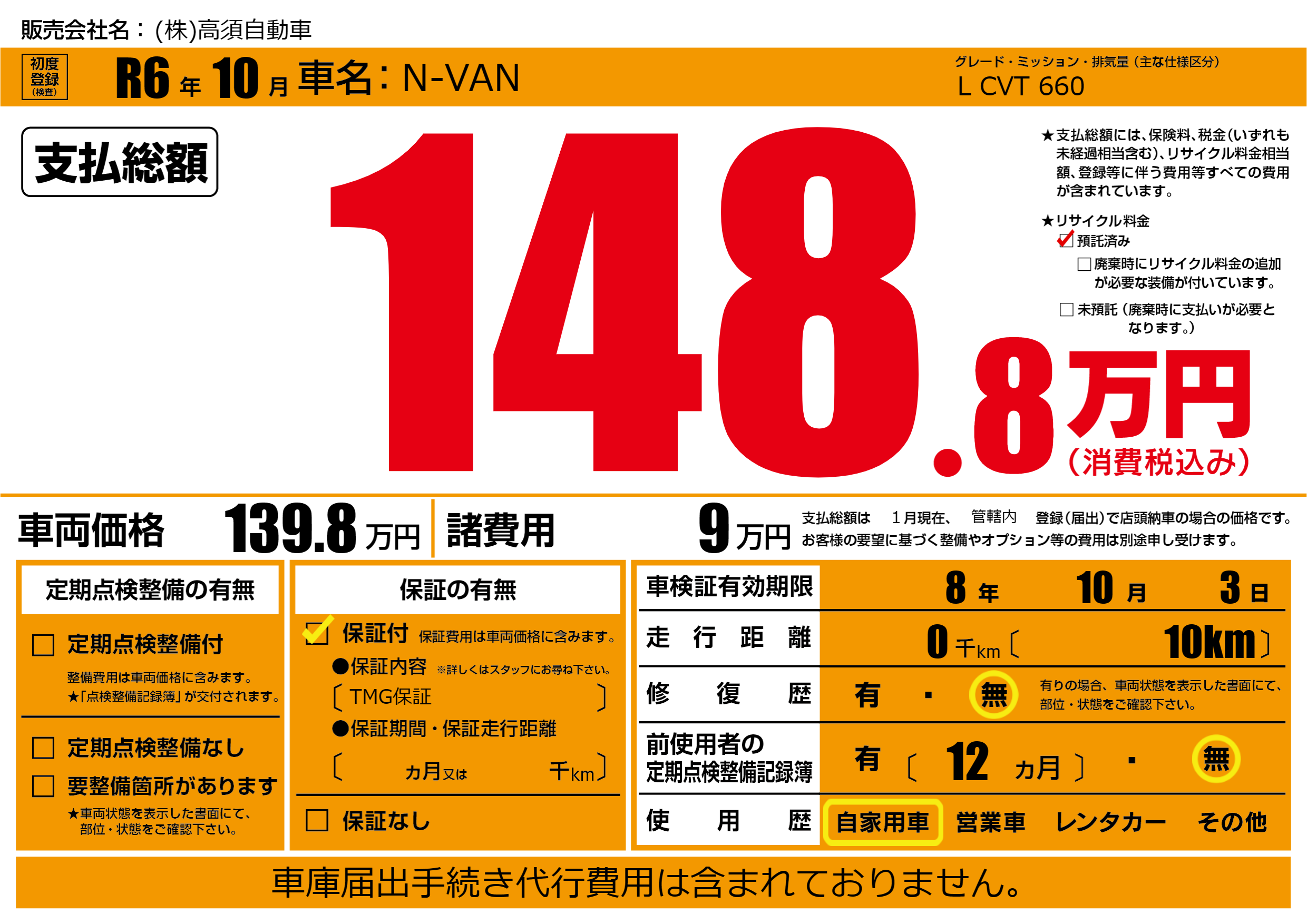 | 車名 | N-VAN | グレード ミッション 排気量 |