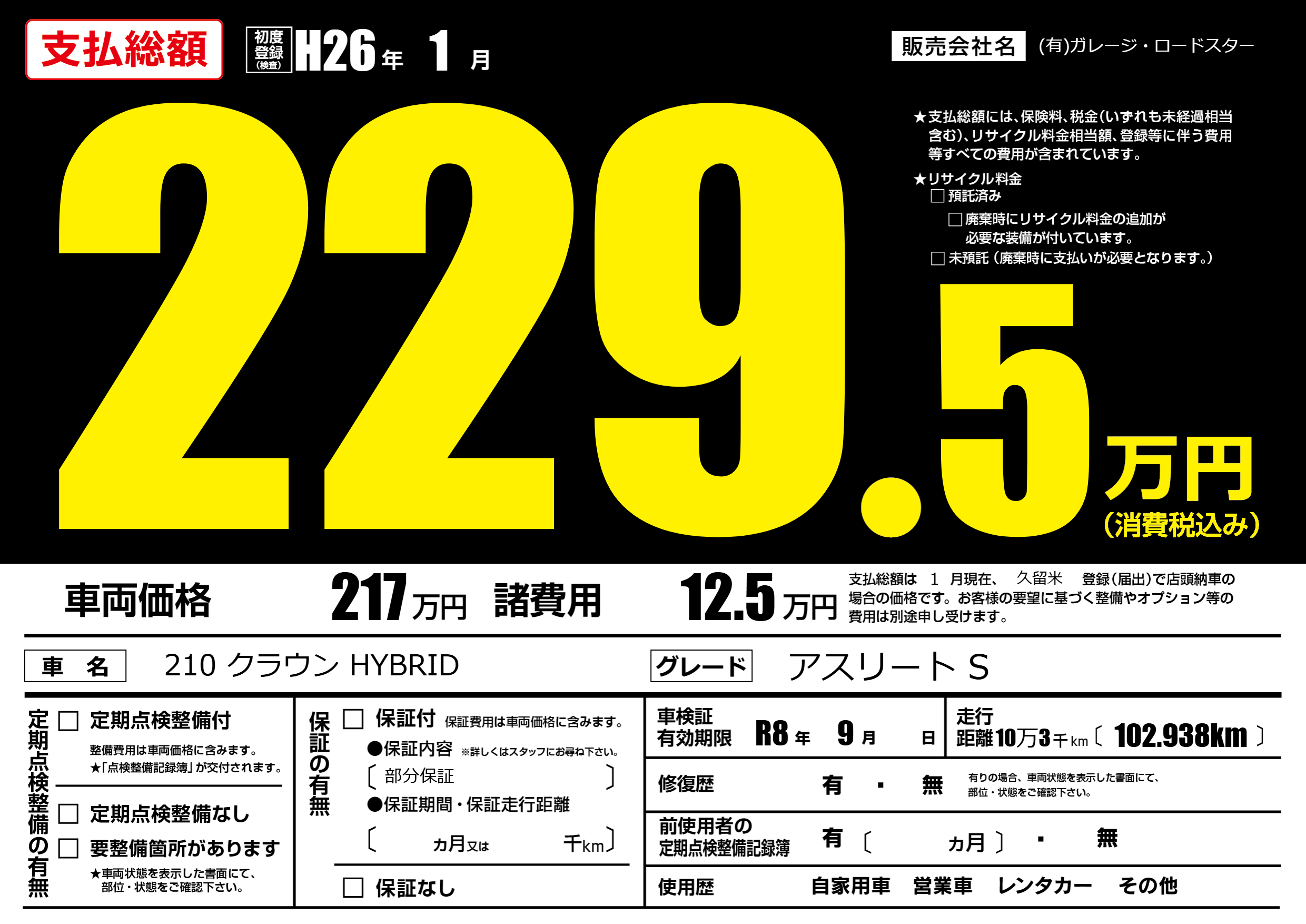 | 車名 | 210 クラウン HYBRID | グレード ミッション 排気量 |