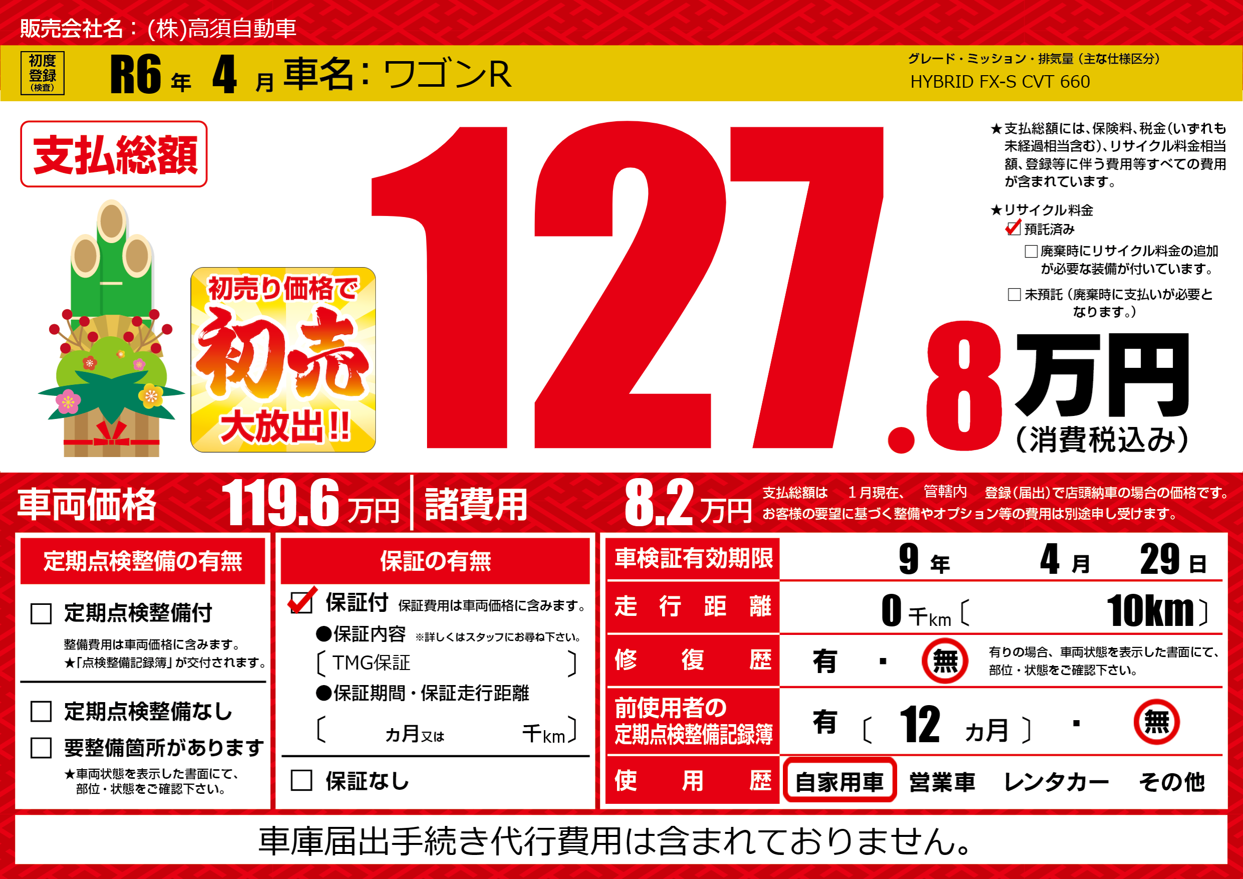 | 車名 | ワゴンR | グレード ミッション 排気量 |