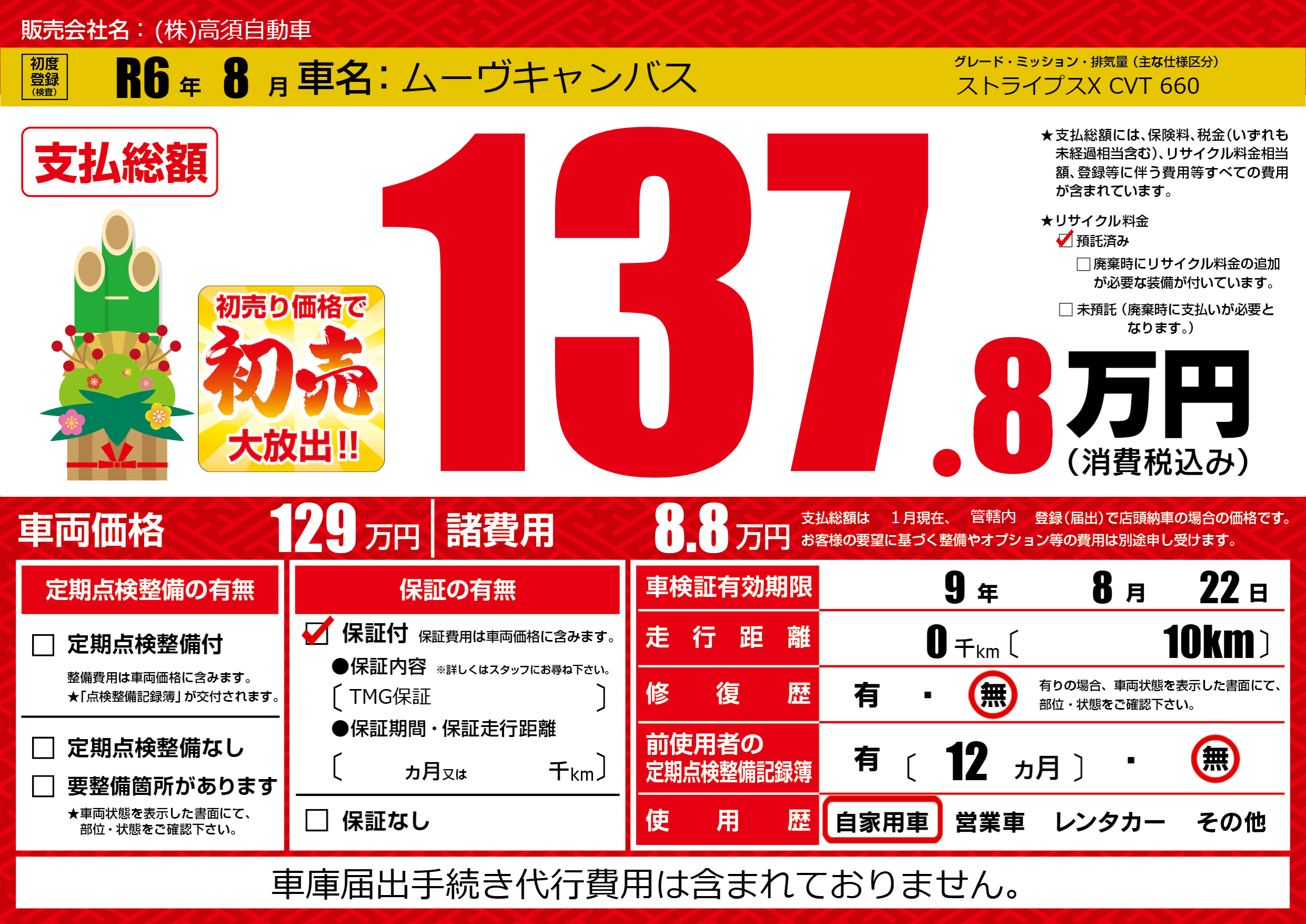 | 走行キロ | - | 初年度登録 | R6年8月 |