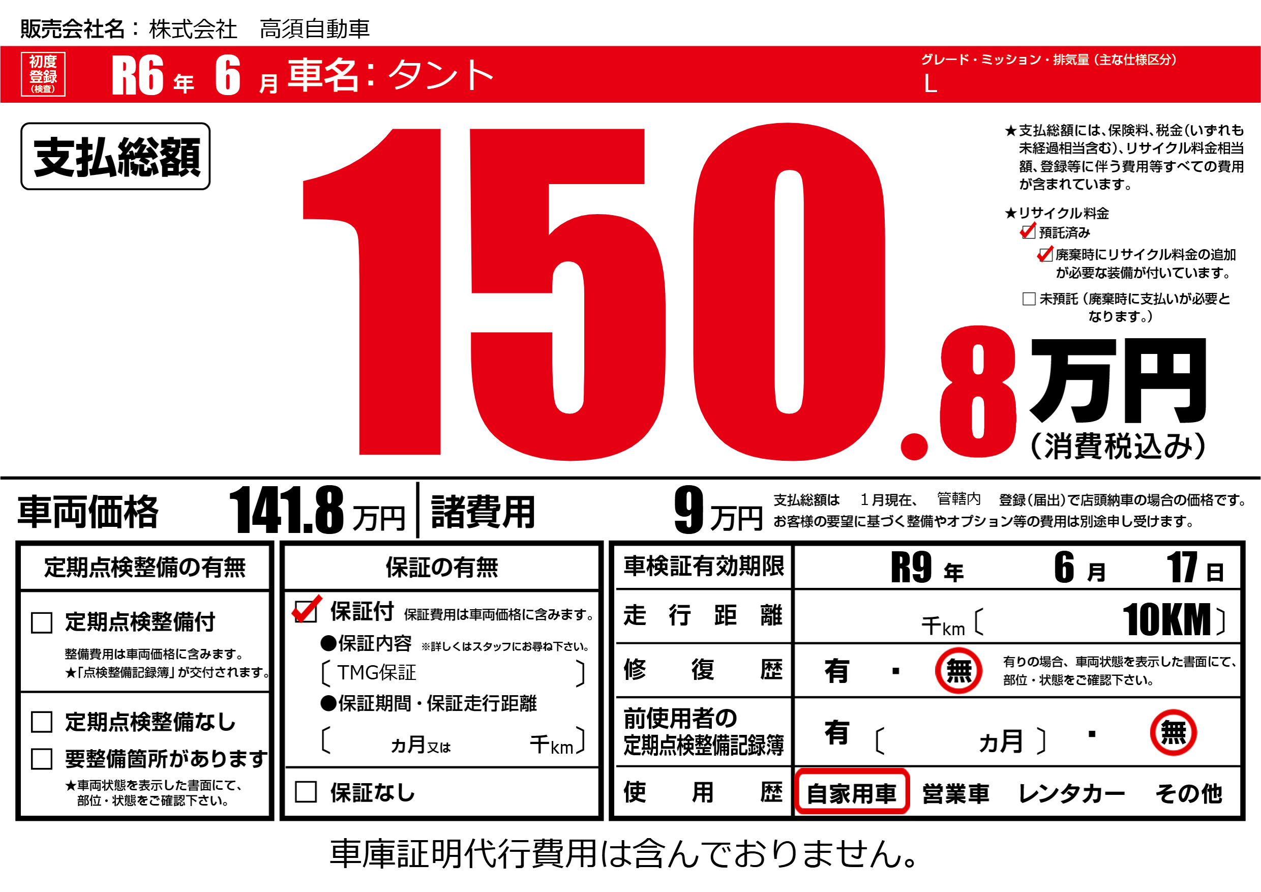 保証付き 保証内容(TMG保証) ---ヶ月または()千kmまで |