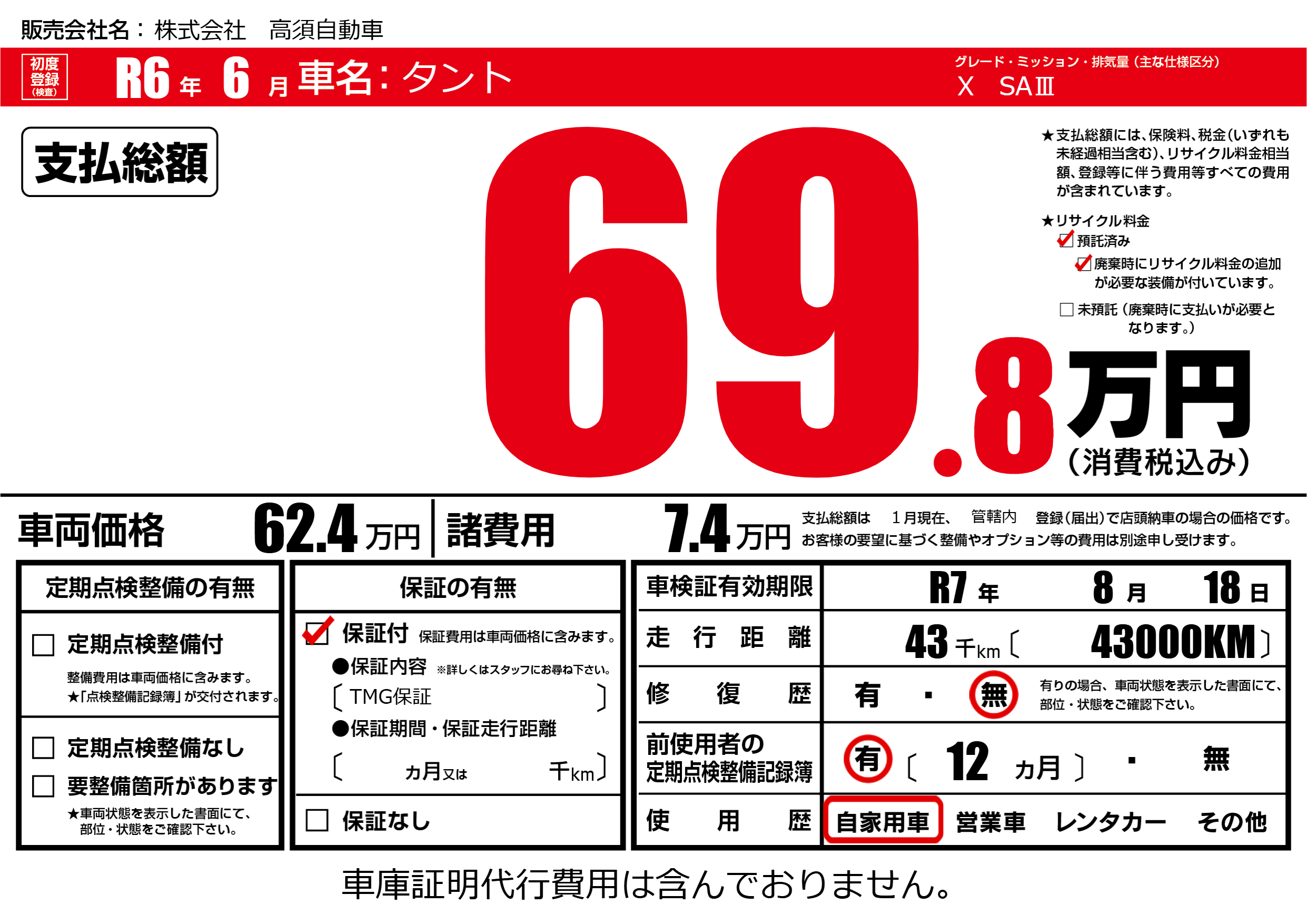 保証付き 保証内容(TMG保証) ---ヶ月または()千kmまで |