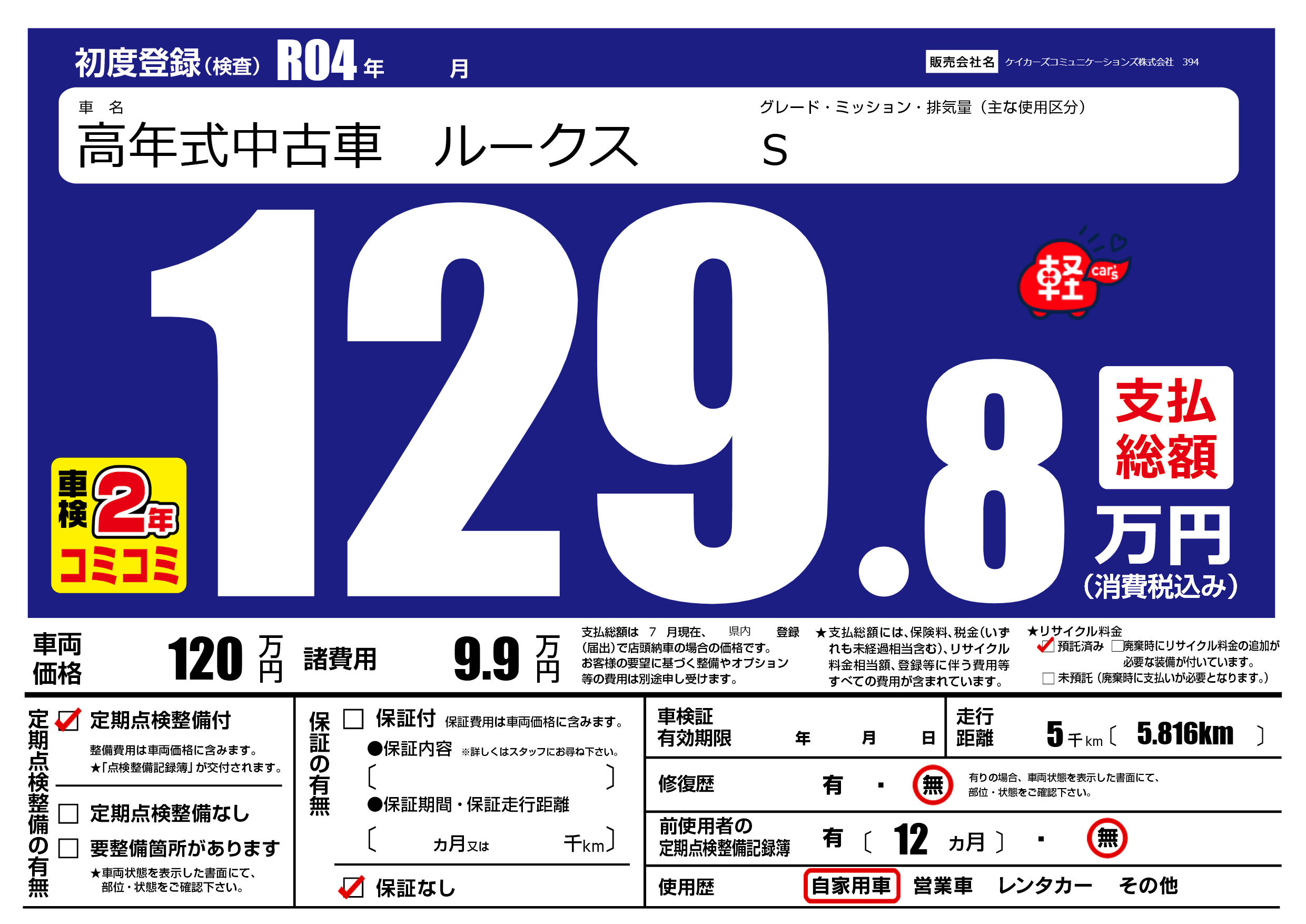 | 走行キロ | 0.5万km | 初年度登録 | R04年---月 |