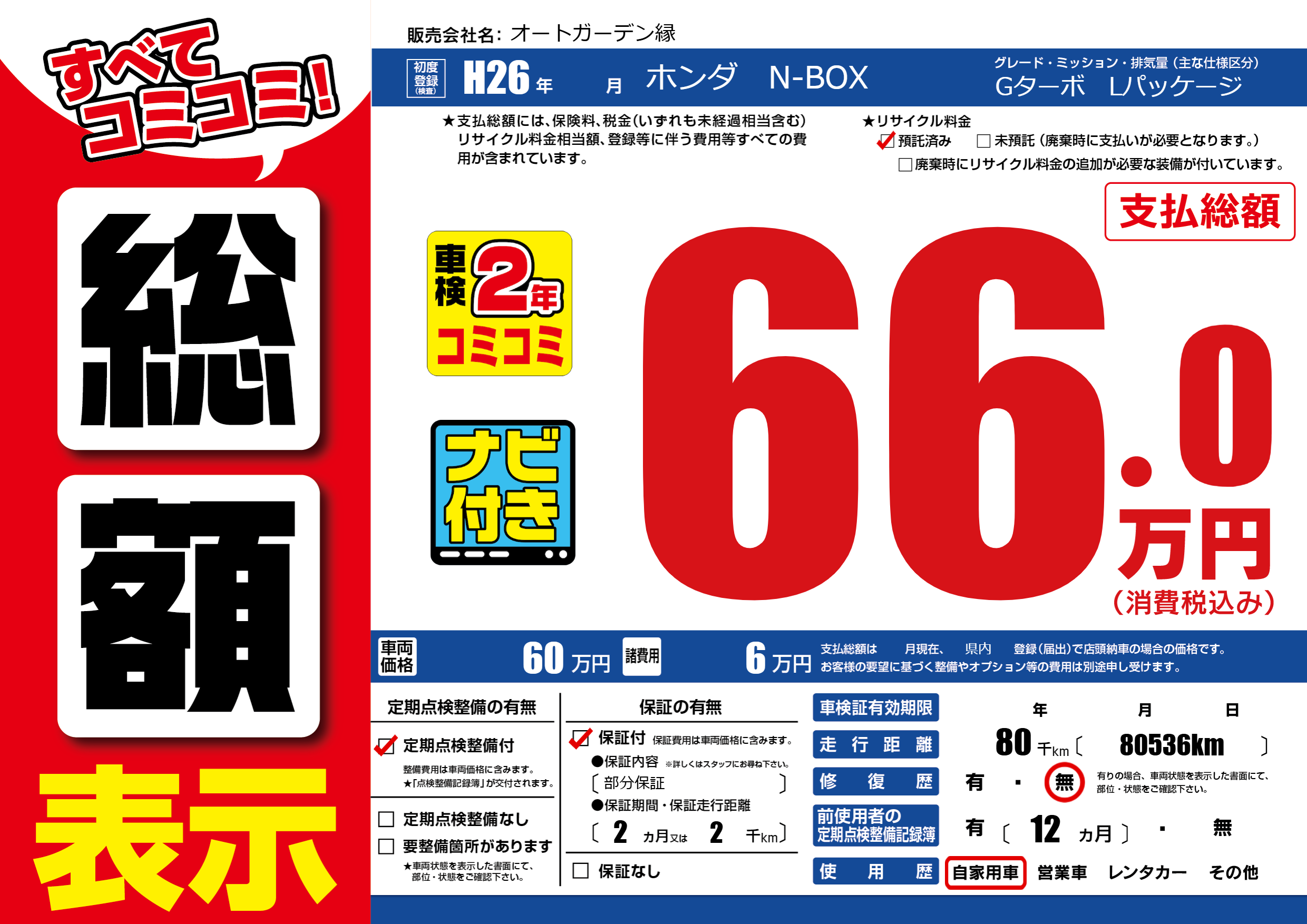 | 車名 | ホンダ N-BOX | グレード ミッション 排気量 |