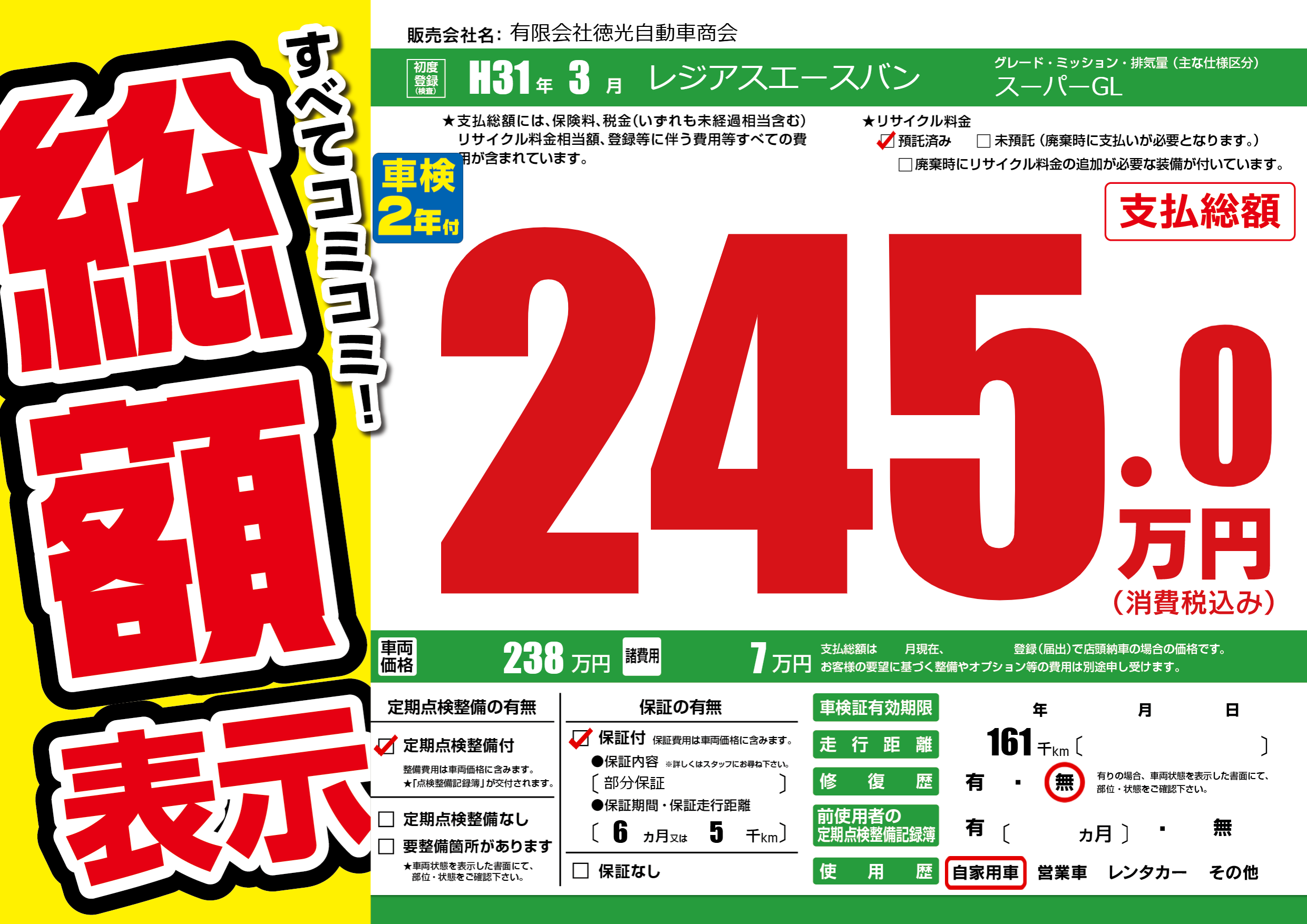 | 走行キロ | 16.1万km | 初年度登録 | H31年3月 |