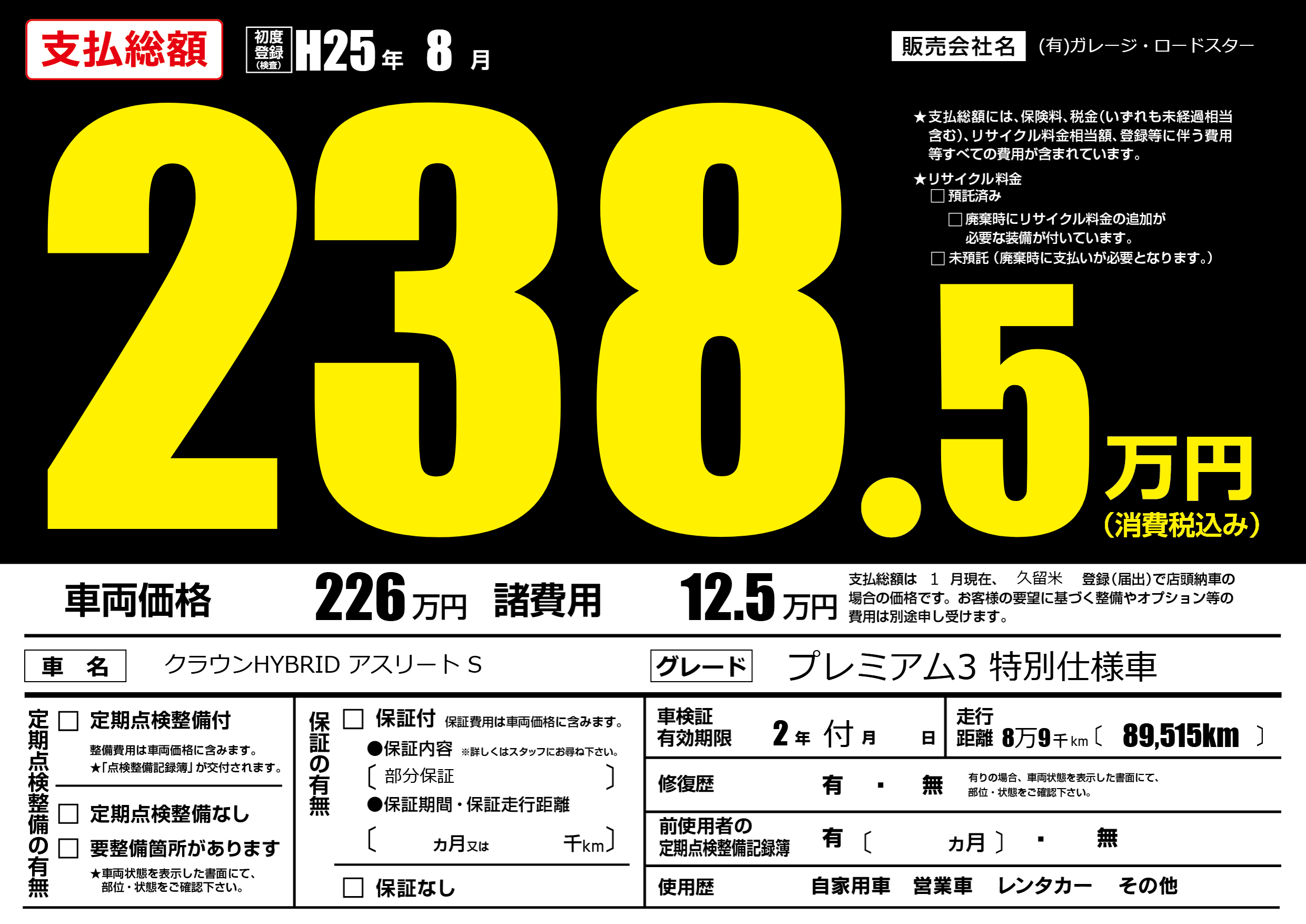 | 車名 | クラウンHYBRID アスリート S | グレード ミッション 排気量 |