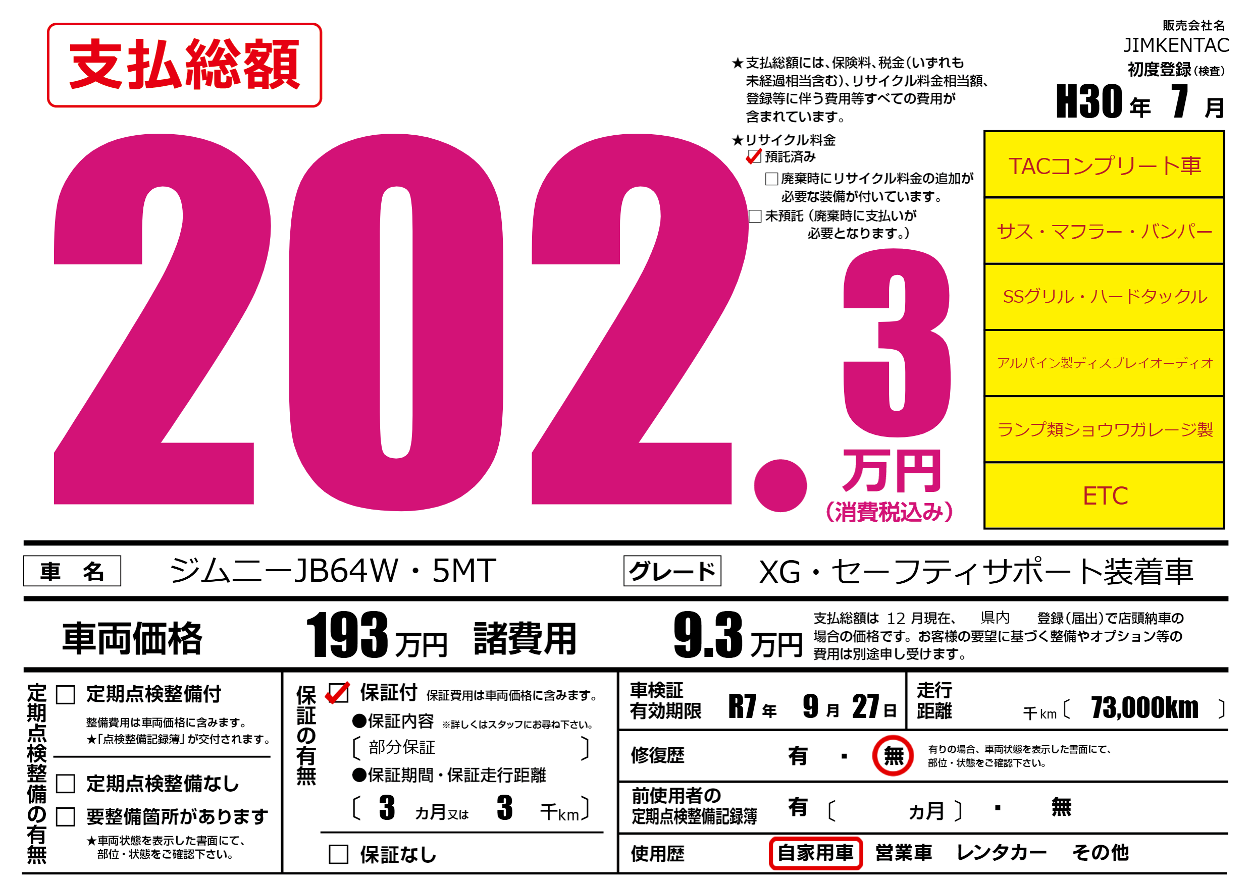 | 車名 | ジムニーJB64W・5MT | グレード ミッション 排気量 |