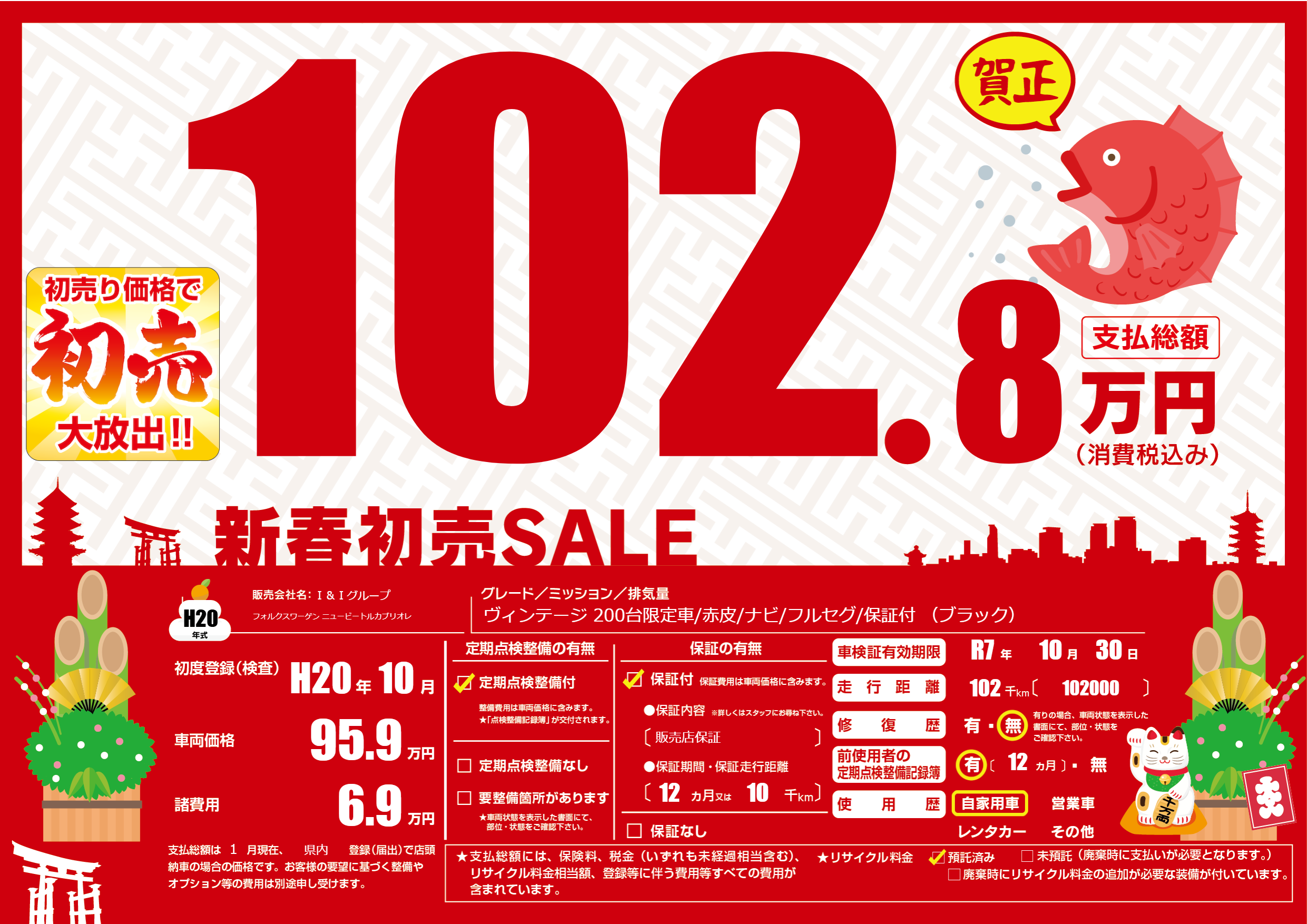 | 走行キロ | 10.2万km | 初年度登録 | H20年10月 |