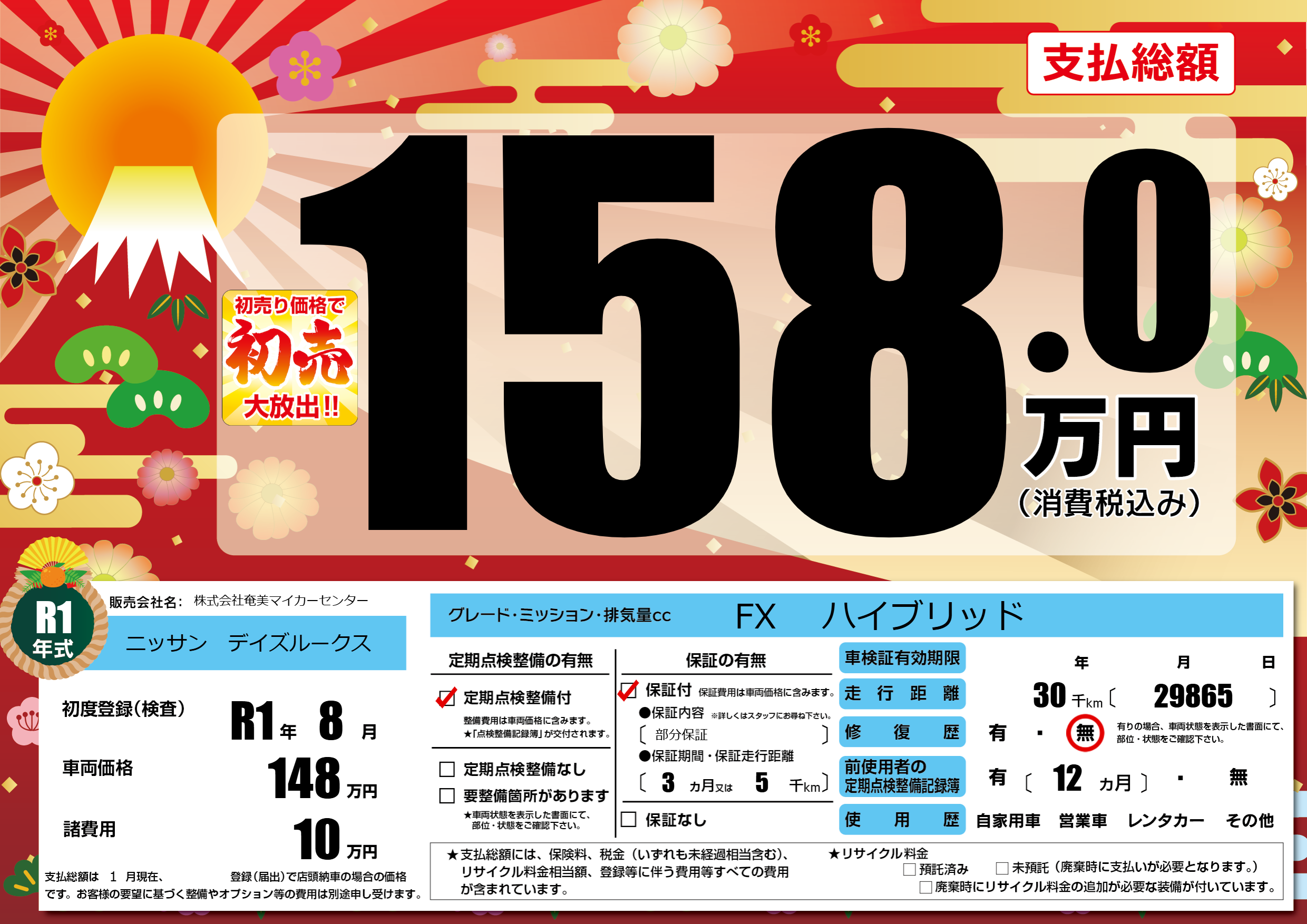 | 走行キロ | 3万km | 初年度登録 | R1年8月 |