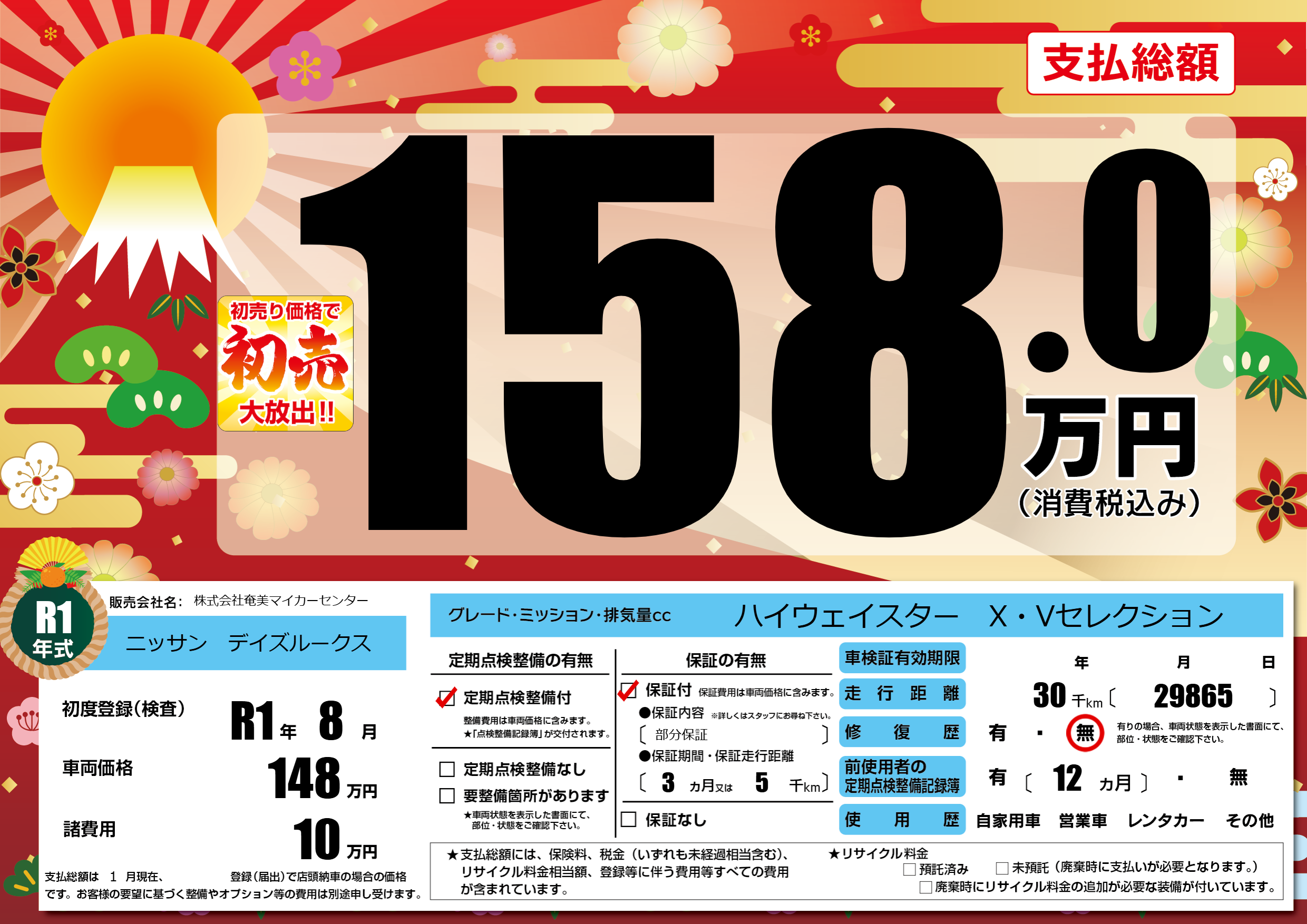 | 走行キロ | 3万km | 初年度登録 | R1年8月 |