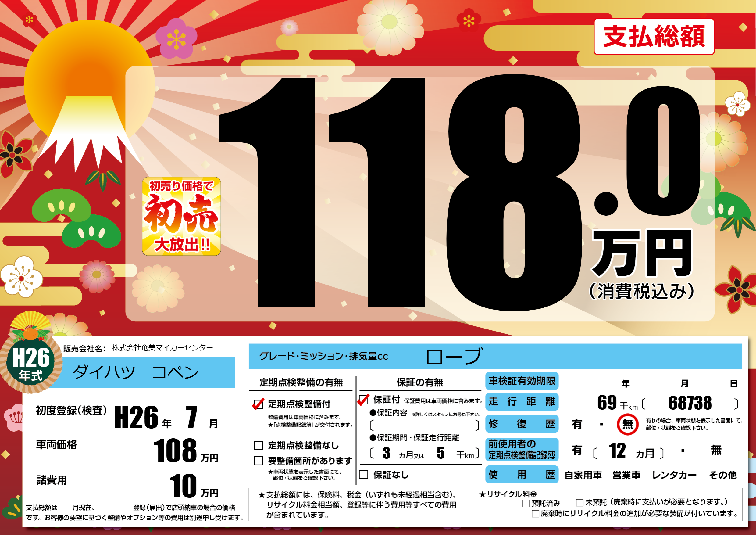 | 車名 | ダイハツ コペン | グレード ミッション 排気量 |
