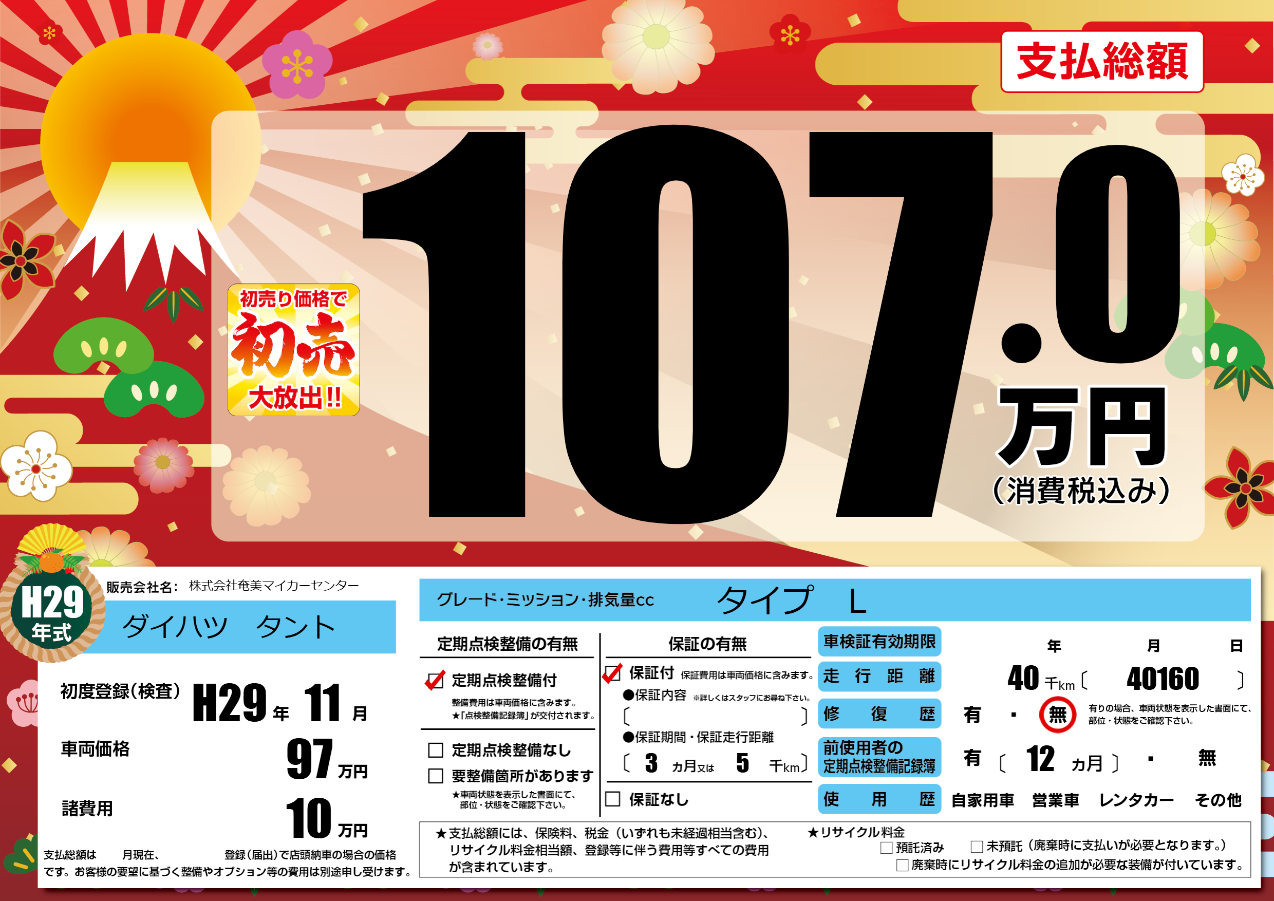 | 車名 | ダイハツ タント | グレード ミッション 排気量 |