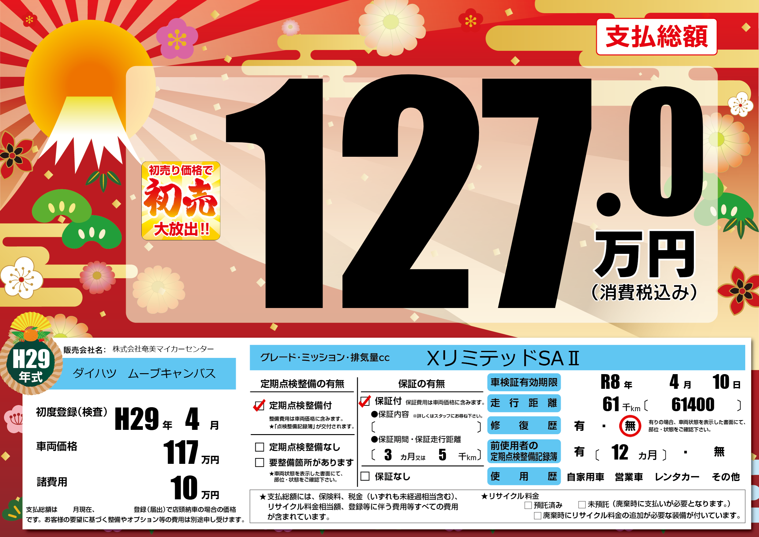 | 走行キロ | 6.1万km | 初年度登録 | H29年4月 |