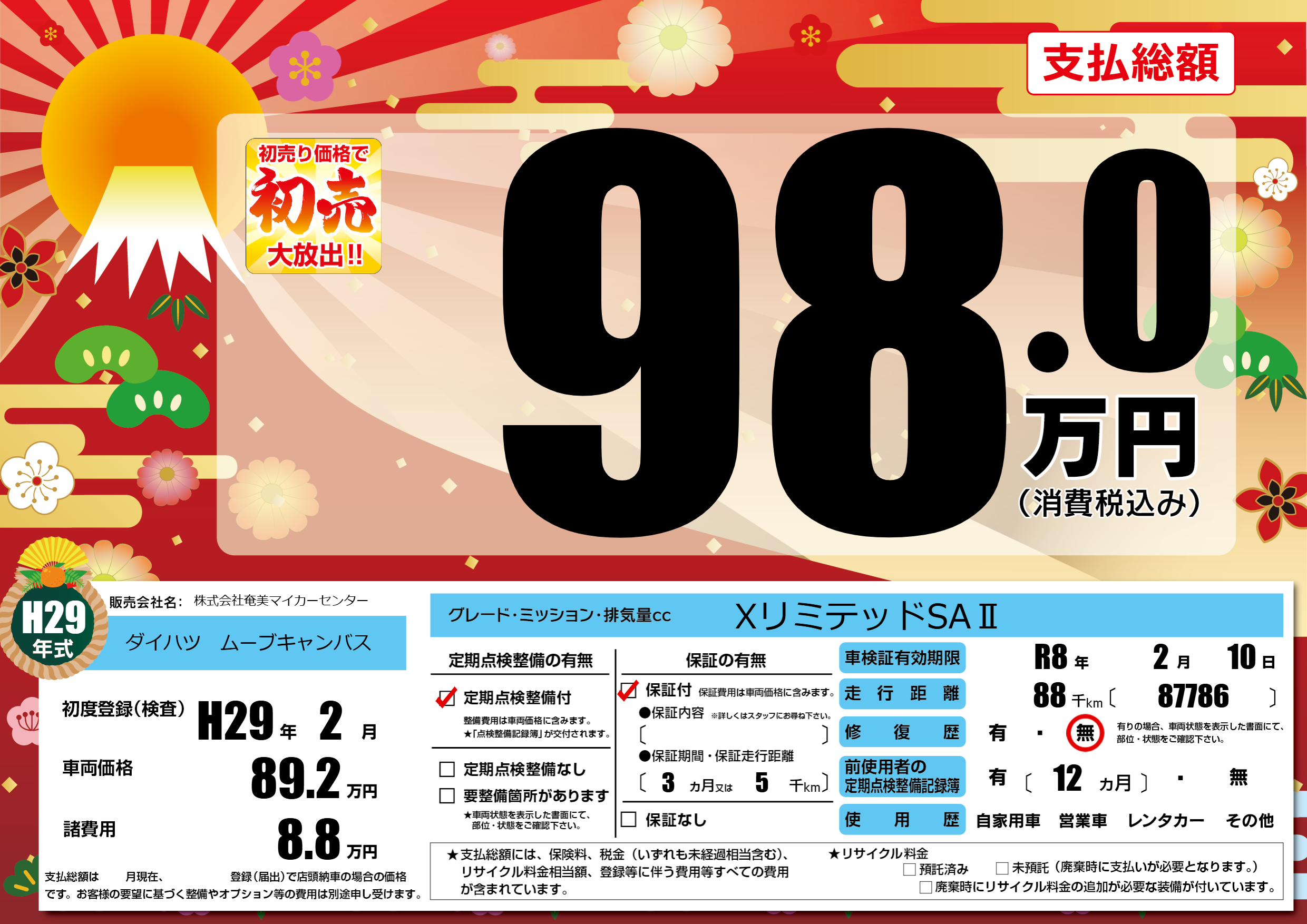 | 走行キロ | 8.8万km | 初年度登録 | H29年2月 |