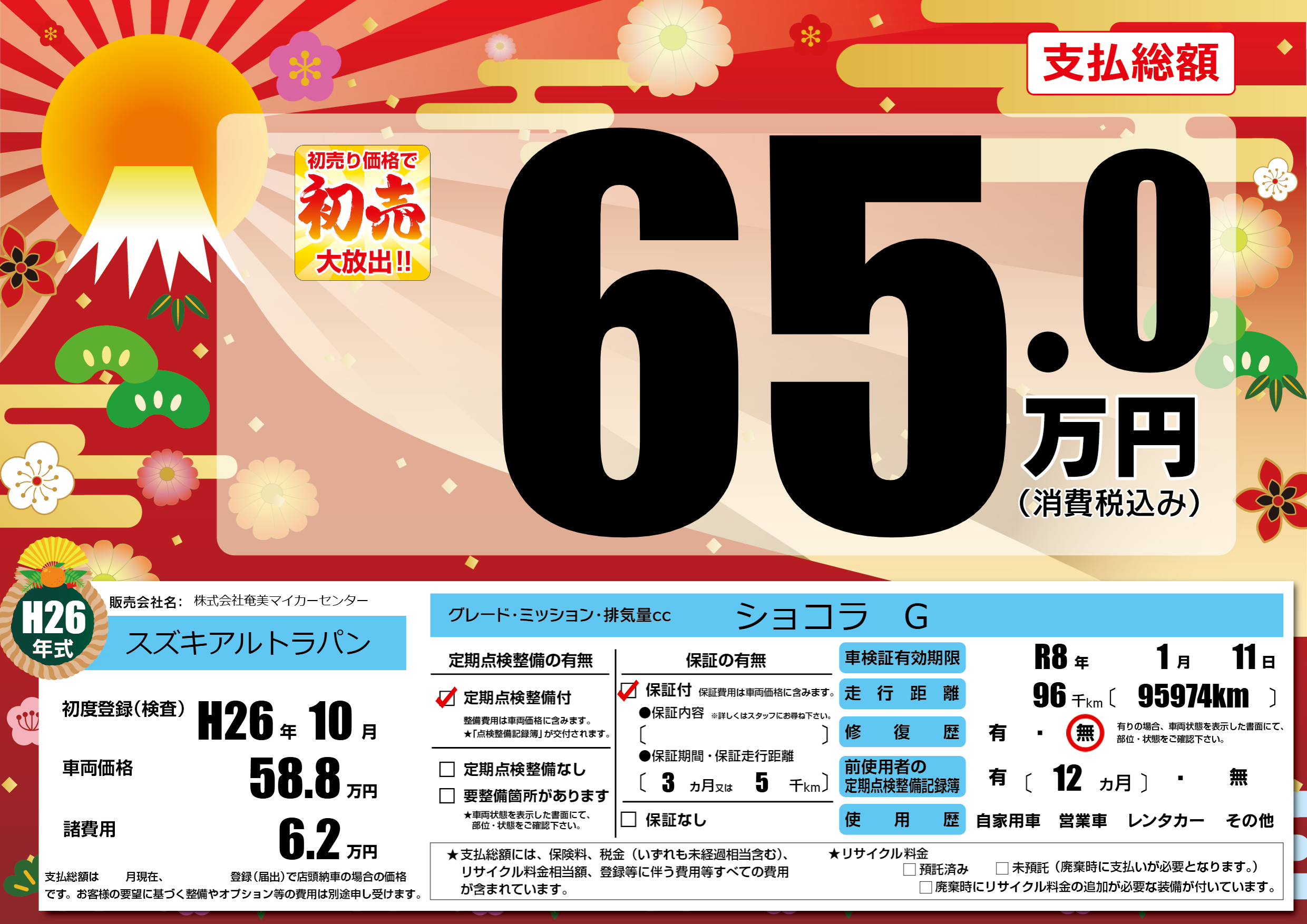 | 走行キロ | 9.6万km | 初年度登録 | H26年10月 |
