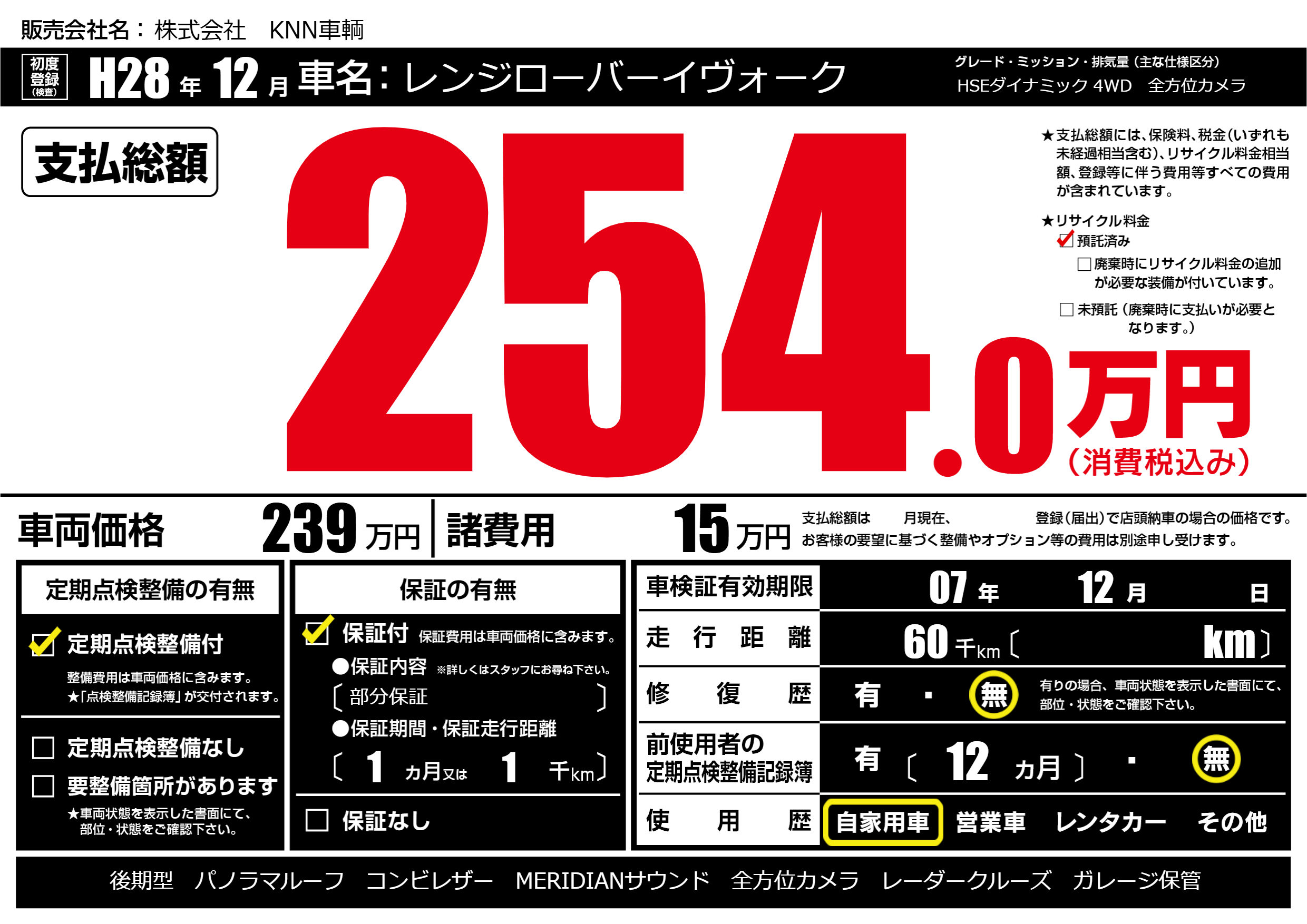 | 走行キロ | 6万km | 初年度登録 | H28年12月 |