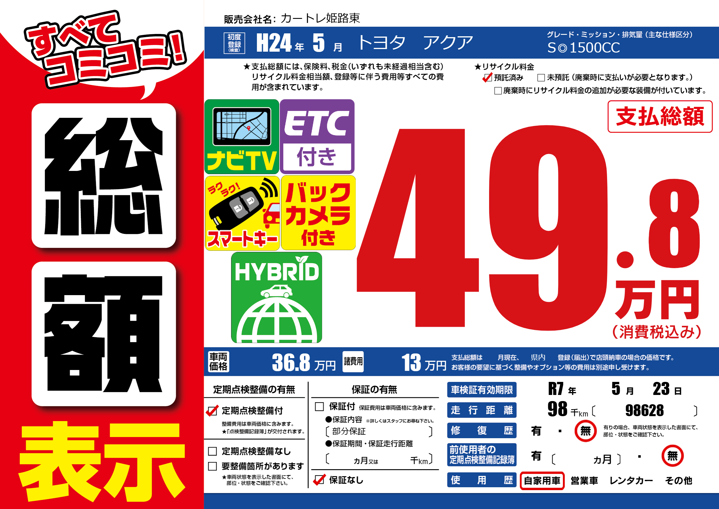 | 走行キロ | 9.8万km | 初年度登録 | H24年5月 |