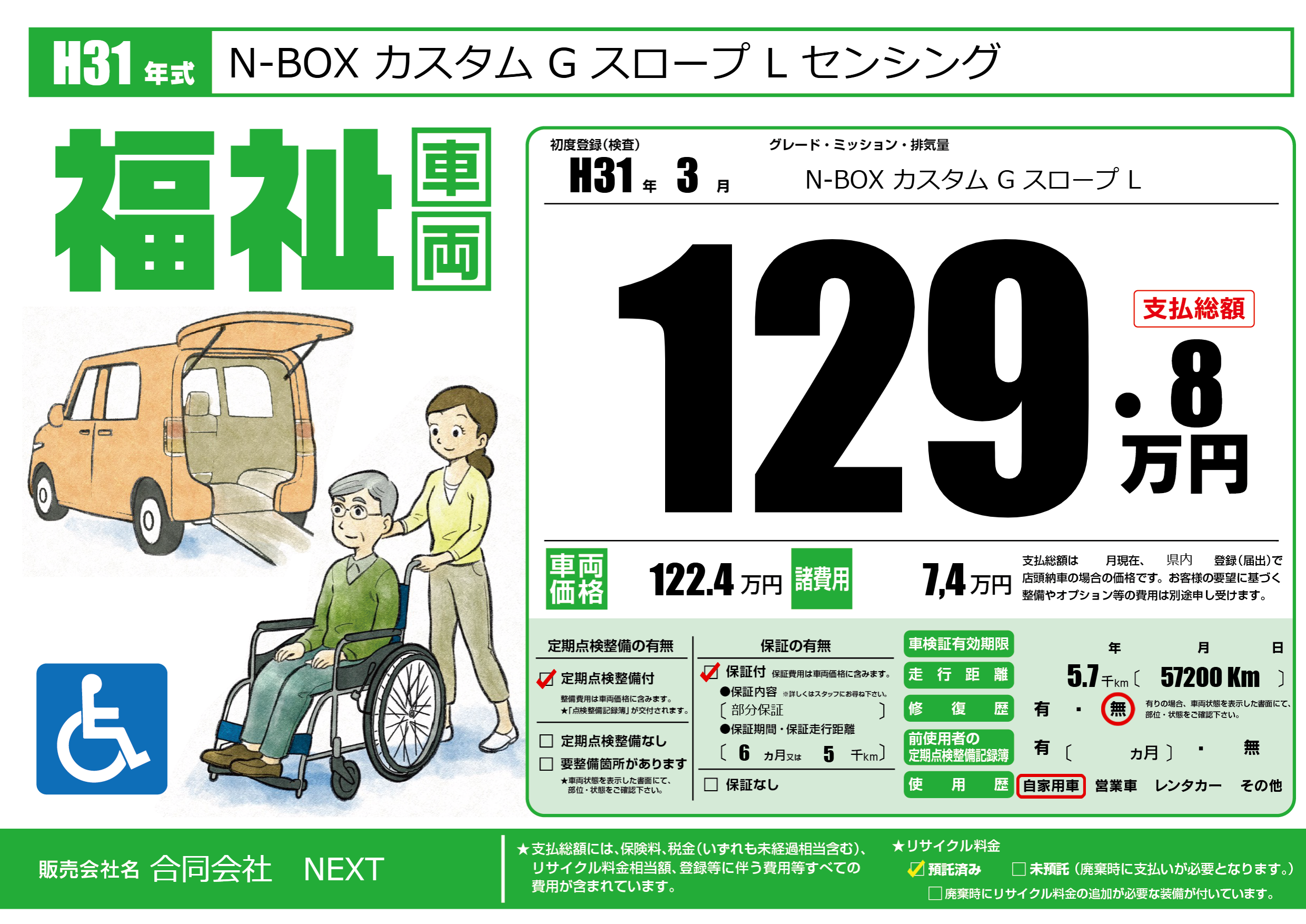 | 車名 | N-BOX カスタム G スロープ L センシング | グレード ミッション 排気量 |