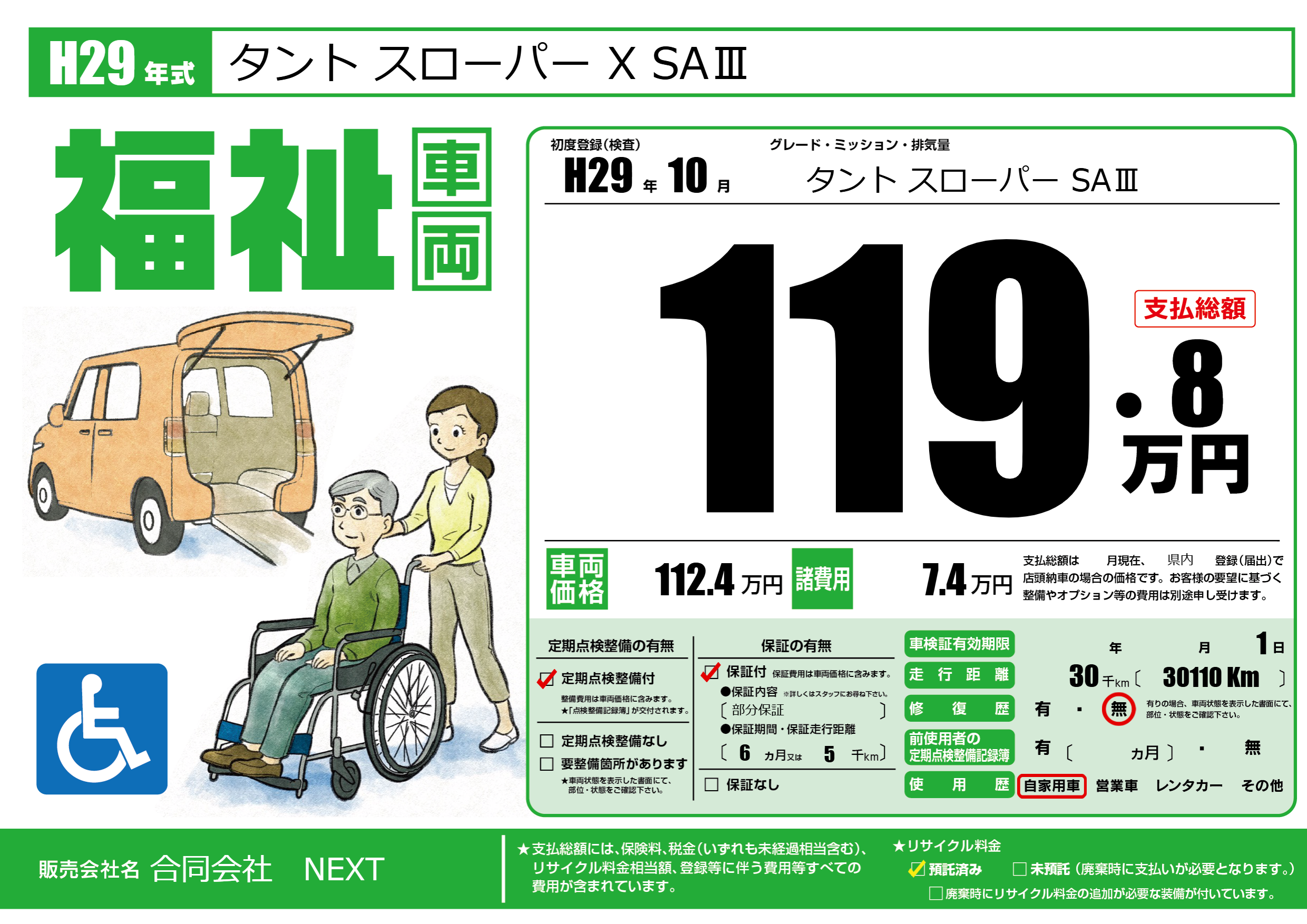 | 車名 | タント スローパー X SAⅢ | グレード ミッション 排気量 |