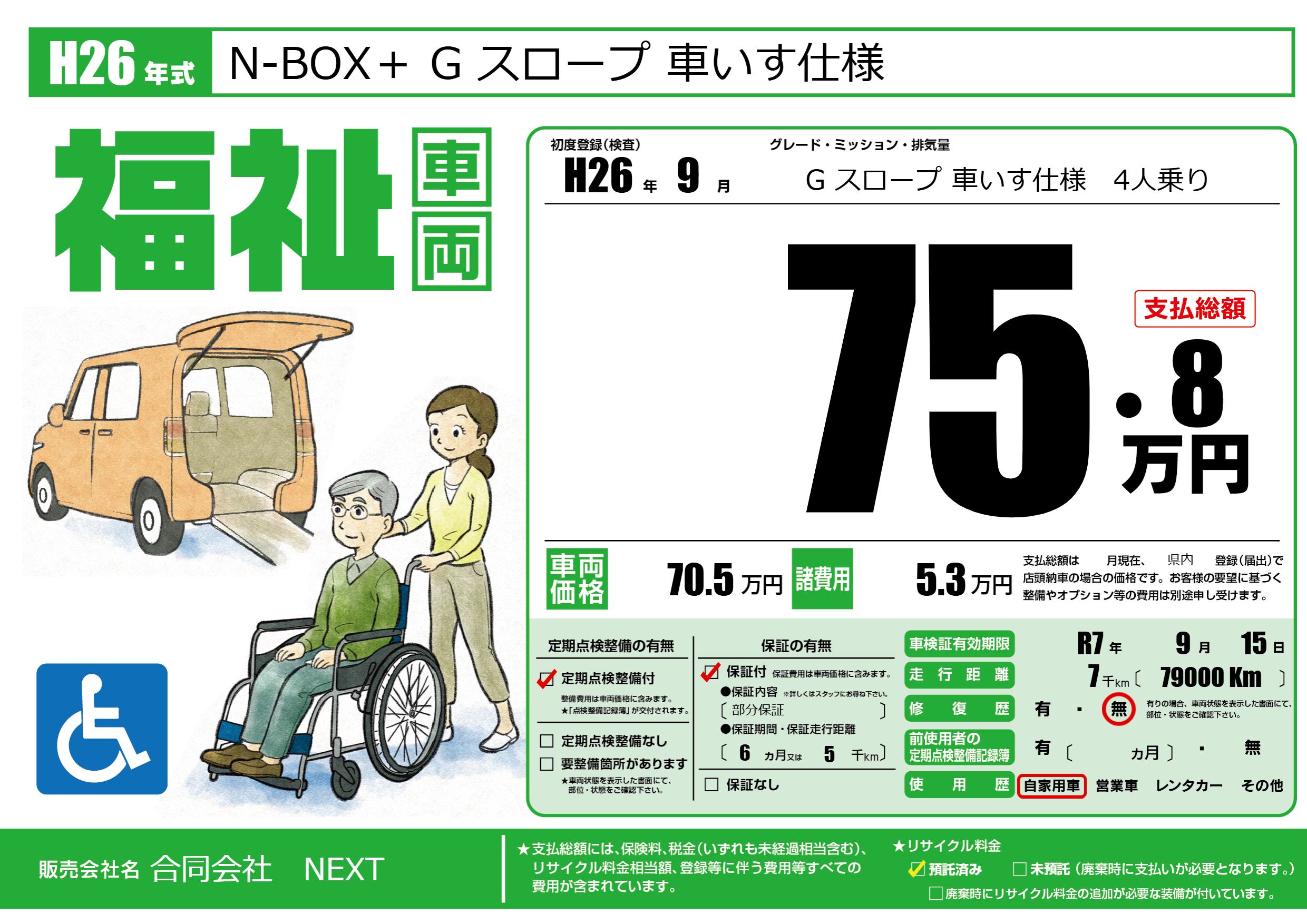 | 車名 | N-BOX+ G スロープ 車いす仕様 | グレード ミッション 排気量 |