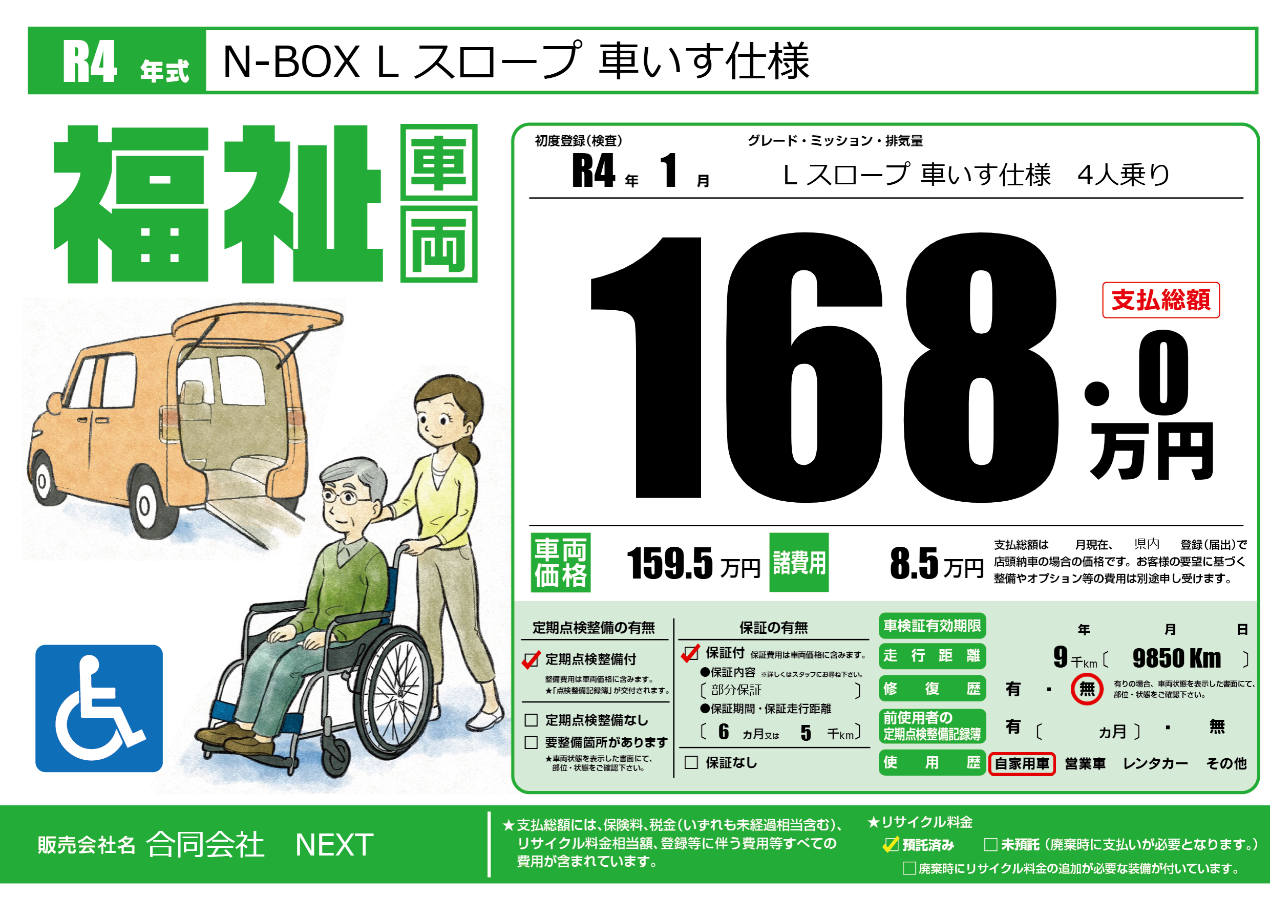 | 車名 | N-BOX L スロープ 車いす仕様 | グレード ミッション 排気量 |