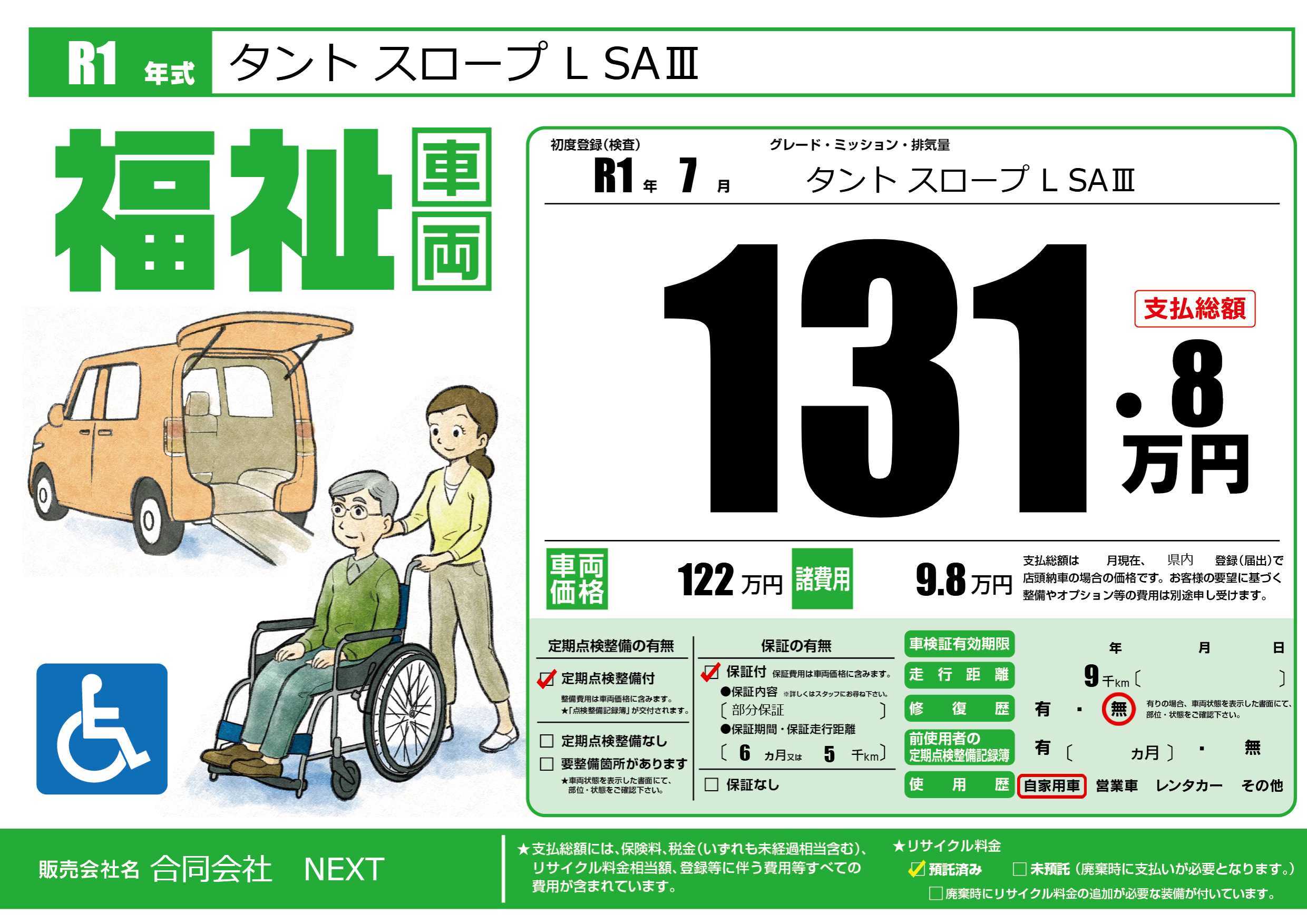 | 車名 | タント スロープ L SAⅢ | グレード ミッション 排気量 |