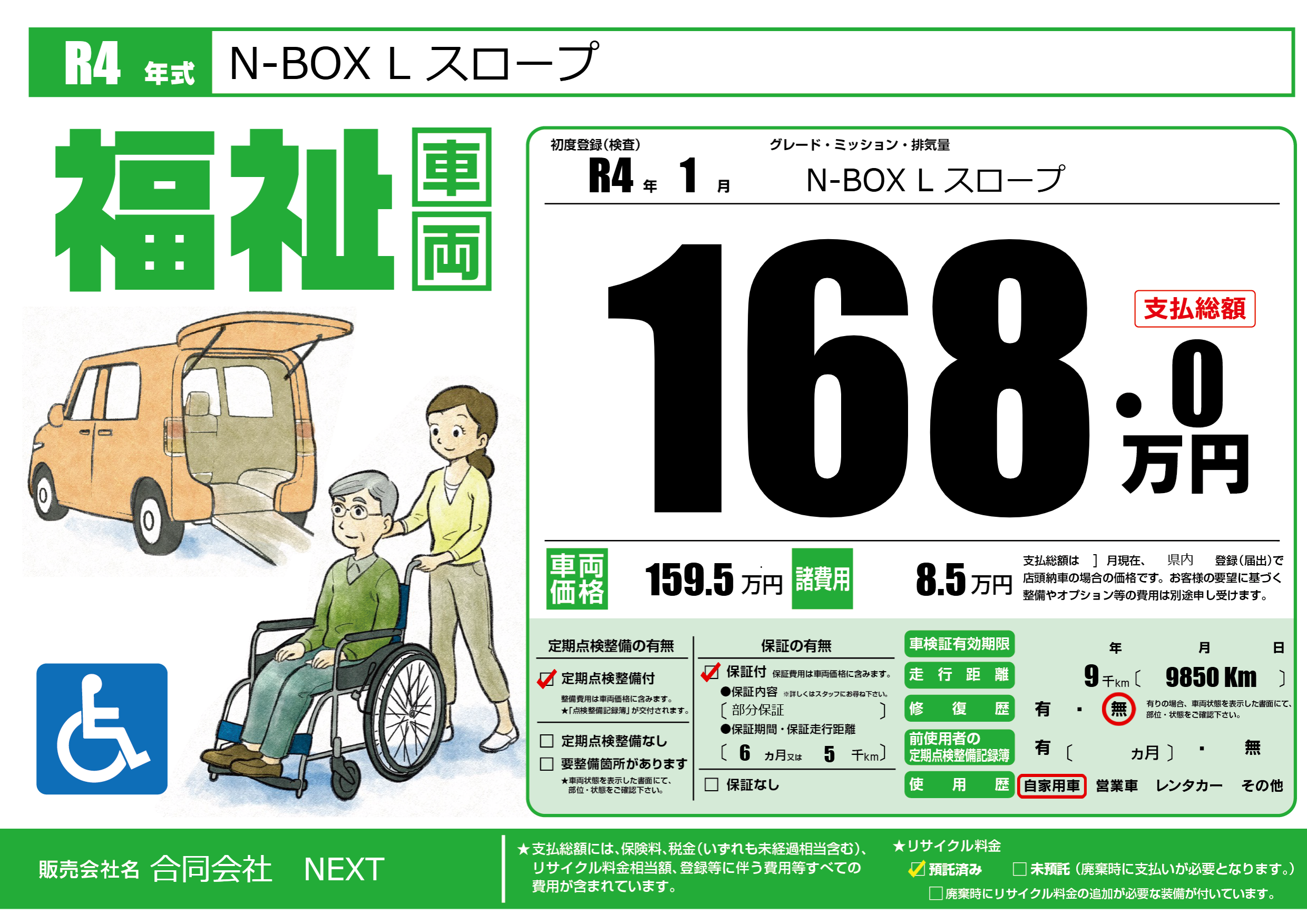 | 車名 | N-BOX L スロープ | グレード ミッション 排気量 |