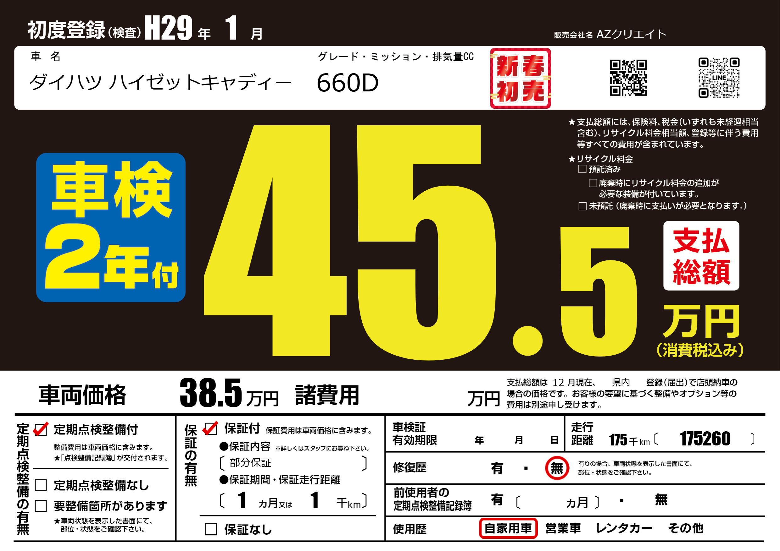 | 走行キロ | 17.5万km | 初年度登録 | H29年1月 |