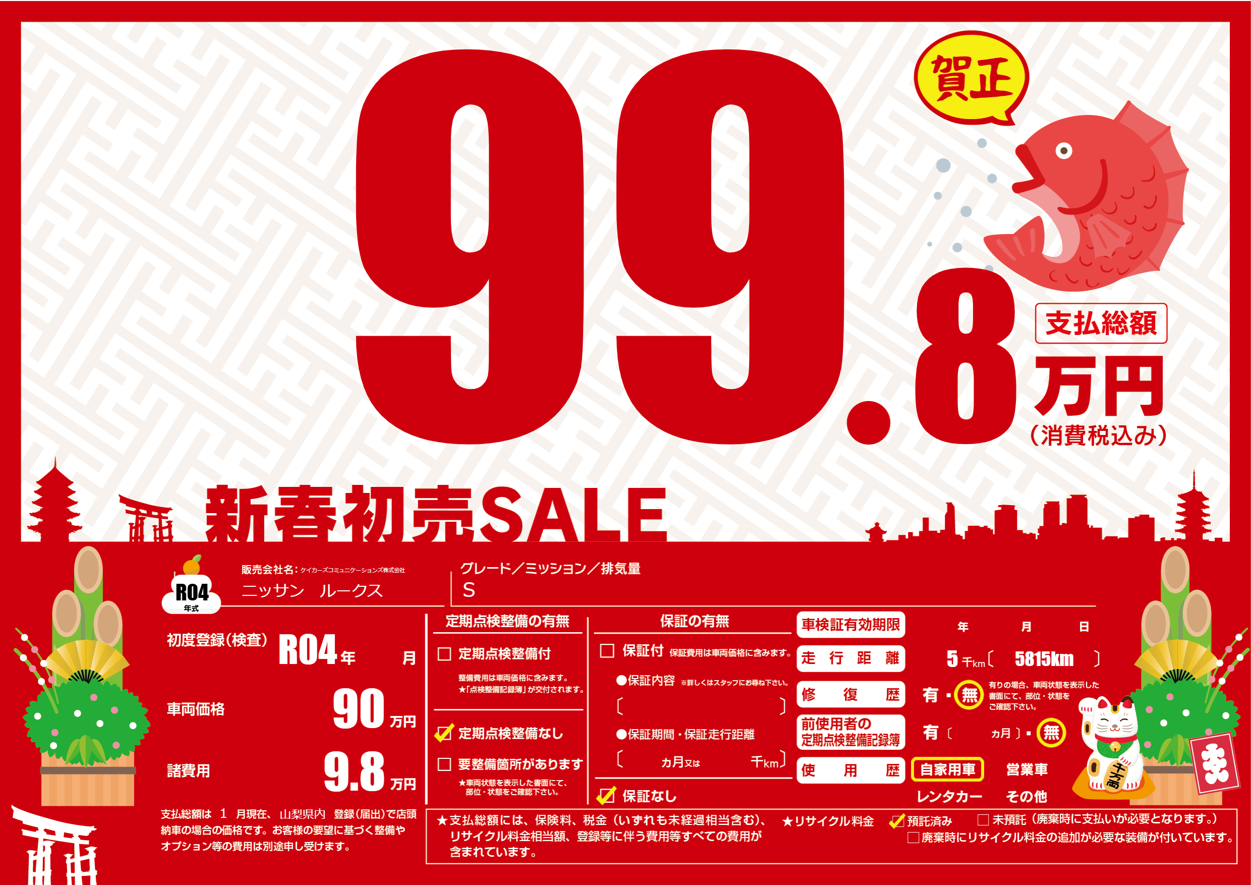| 走行キロ | 0.5万km | 初年度登録 | R04年---月 |