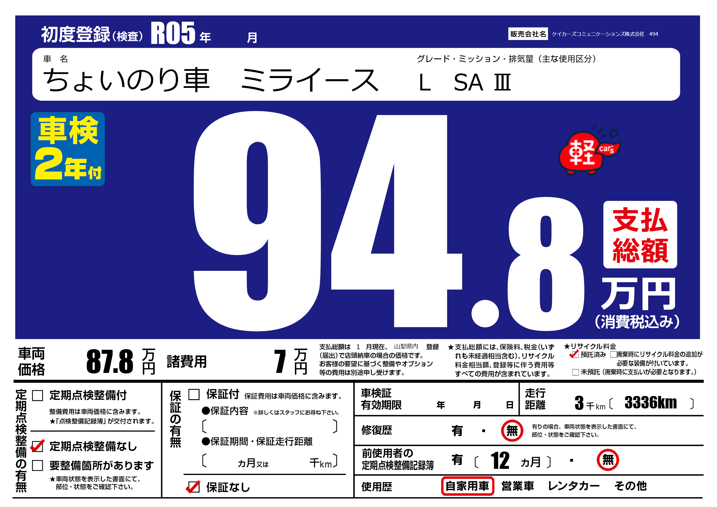 | 走行キロ | 0.3万km | 初年度登録 | R05年---月 |